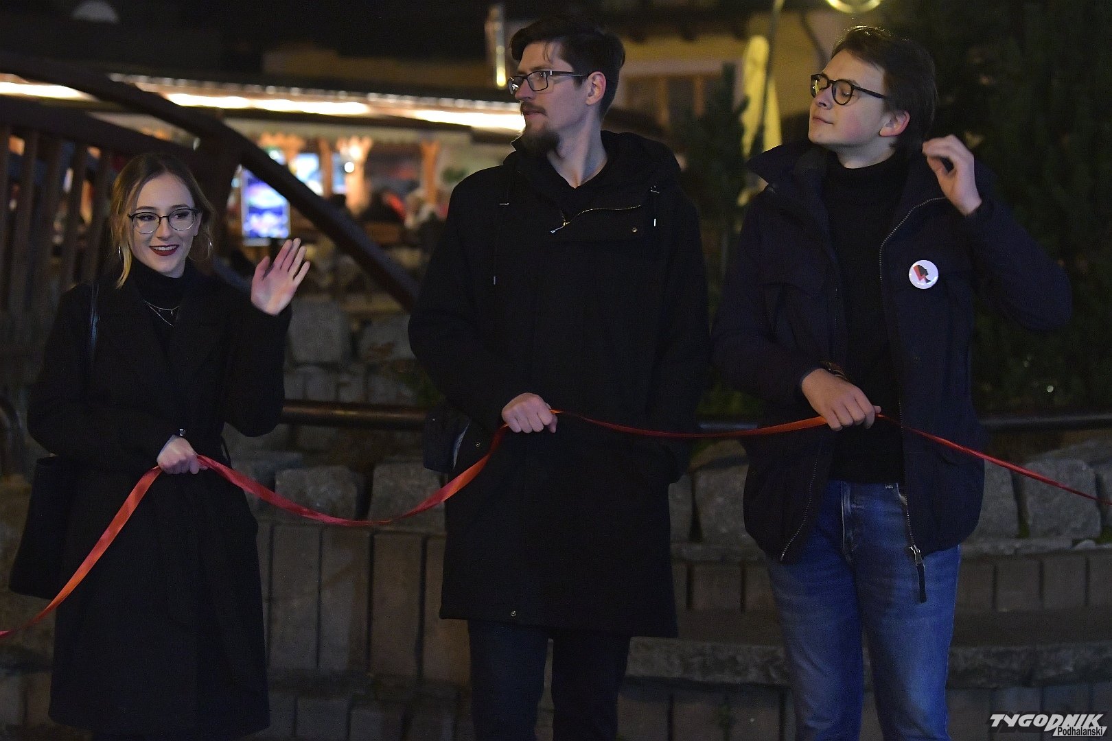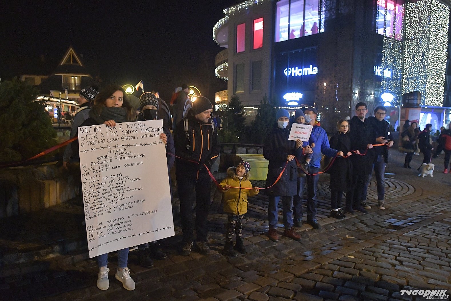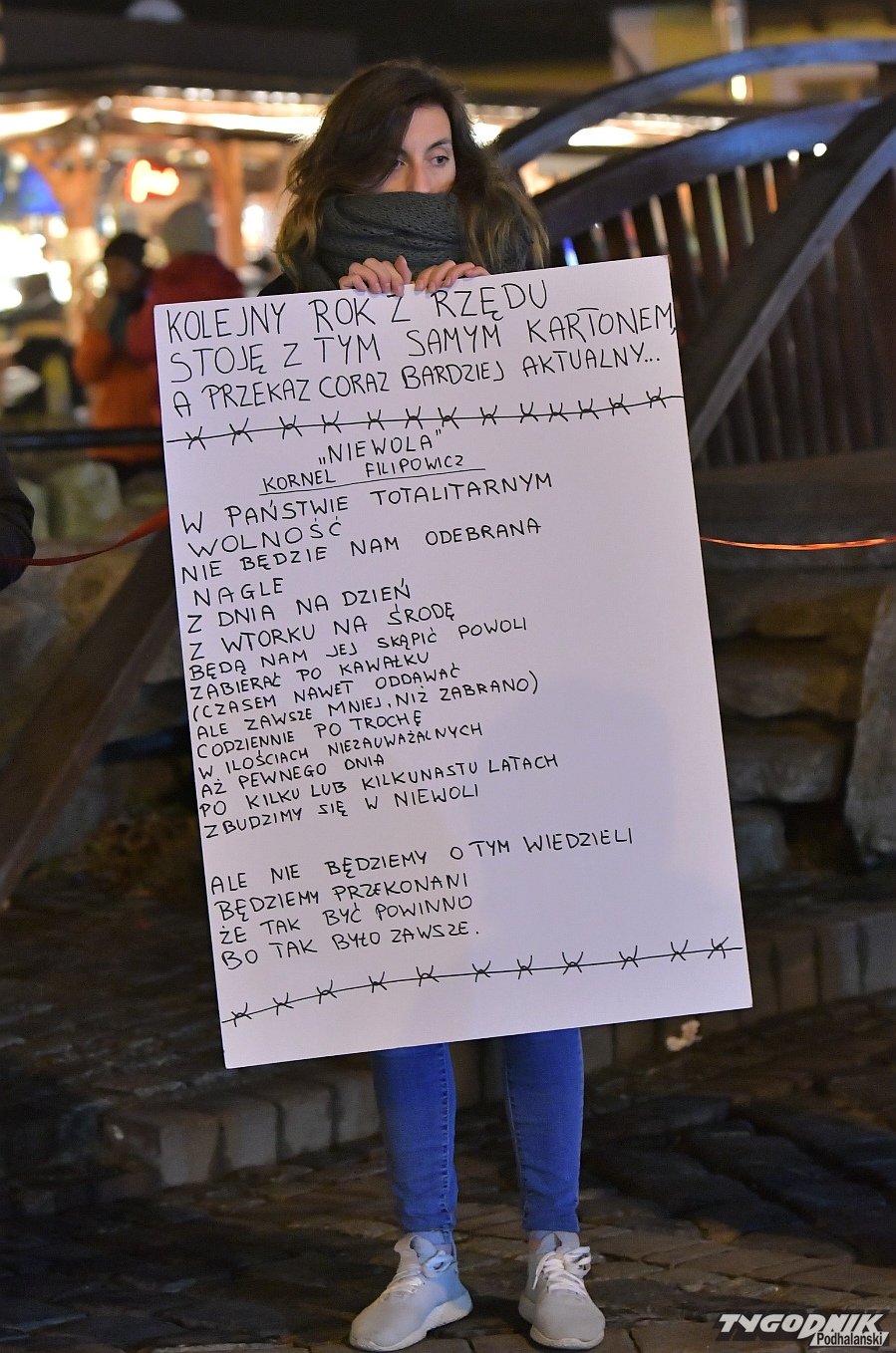 Zebrani połączyli się czerwonym "łańcuchem siostrzeństwa" po śmierci kobiety w Pszczynie. Zbierali podpisy pod obywatelskim projektem bezpiecznego przerywania ciąży. Na transparentach m. in. wiersz Kornela Filipowicza "Niewola" zaczynający się od słów: W państwie totalitarnym; Wolność; Nie będzie nam odebrana; Nagle; Z dnia na dzień; Z wtorku na środę; Będą nam jej skąpić powoli; Zabierać po kawałku;