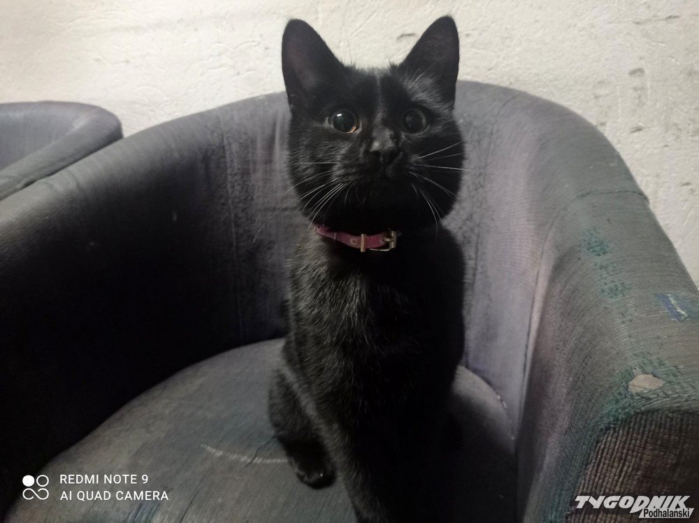 Czarny kotek z obrożą przyszedł do hotelu Belvedere w Zakopanem. Tam czekał na właściciela.