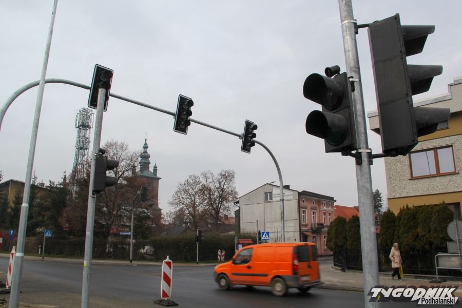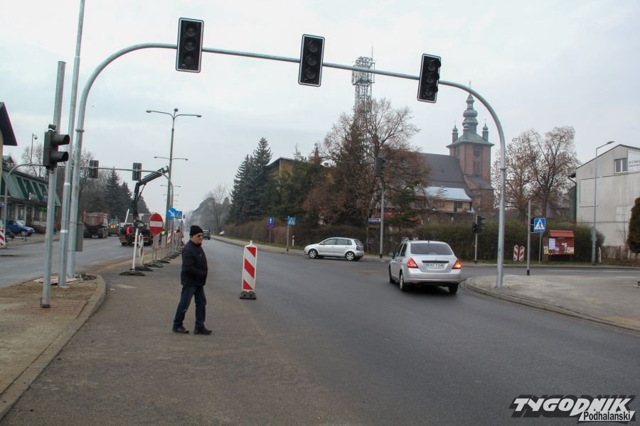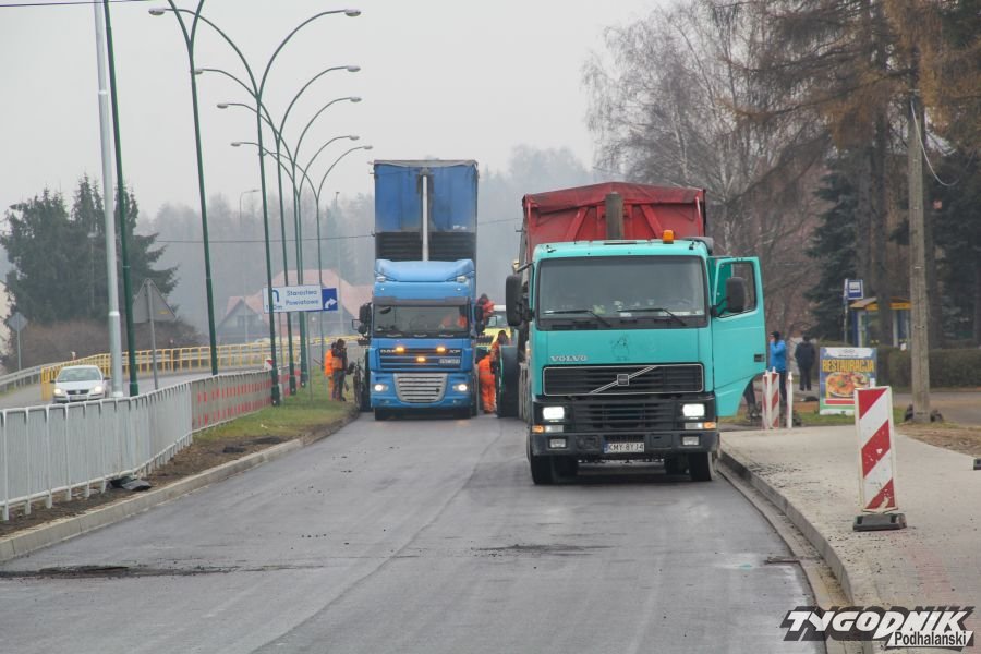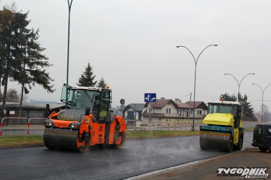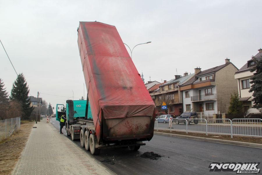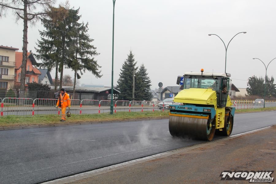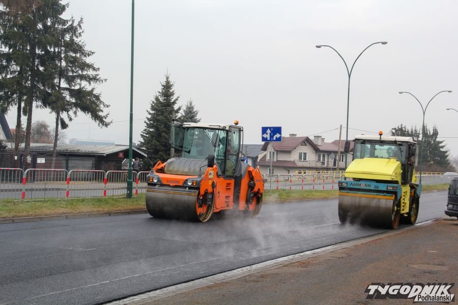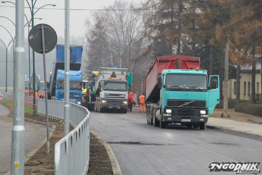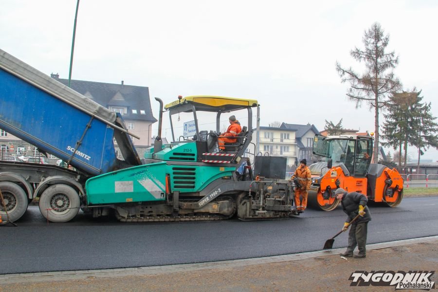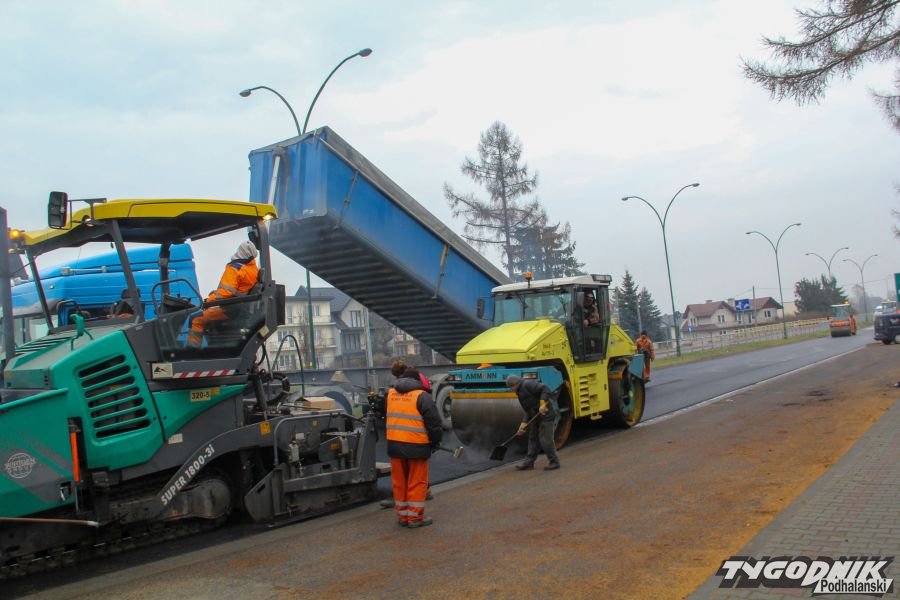 Drogowcy układają ostatnie fragmenty wierzchniej warstwy asfaltu na drugiej nitce Alei Tysiąclecia w Nowym Targu.