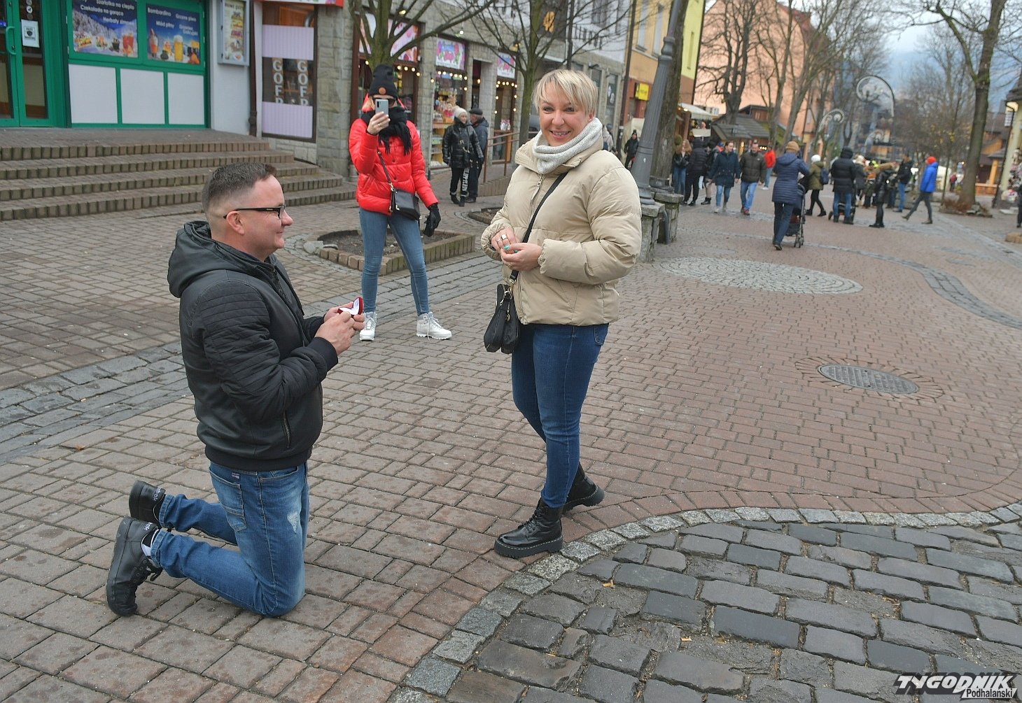 Taka scena dziś na zakopiańskim deptaku: on klęczy, ona nie kryje wzruszenia i przyjmuje zaręczynowy pierścionek.