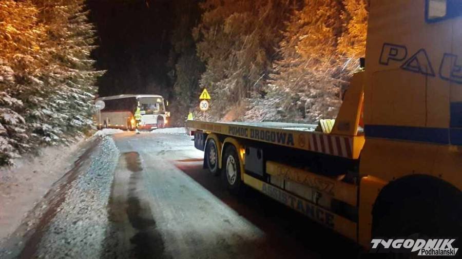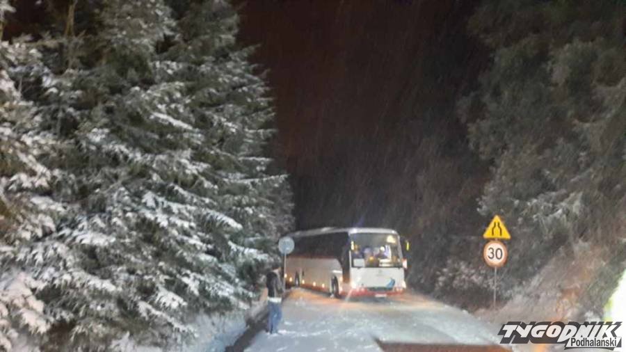 Autobus utknął na śliskiej nawierzchni - droga przez Sieniawę była przez ponad półtorej godziny całkowicie zablokowana.