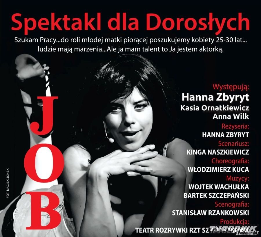 Komediowy spektakl "Job" to jedna ze stałych i bardzo lubianych pozycji z repertuaru Teatru Rozrywki. Scenariusz do niego napisała Kinga Naszkiewicz, a wyreżyserowała go Hanna Zbyryt, którą oczywiście mamy również okazję oglądać na scenie. Wspólnie z nią występują Kasia Ornatkiewicz i Anna Wilk. Trzem paniom towarzyszą muzycy: Wojciech Wachułka i Bartek Szczepański.