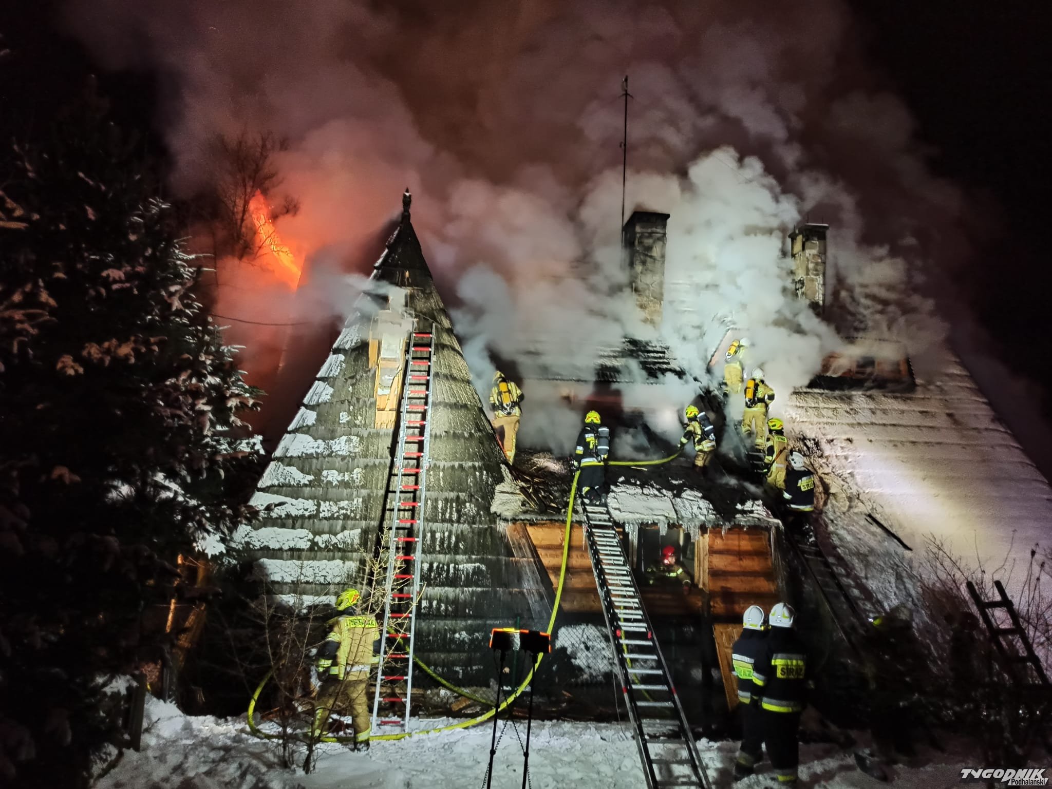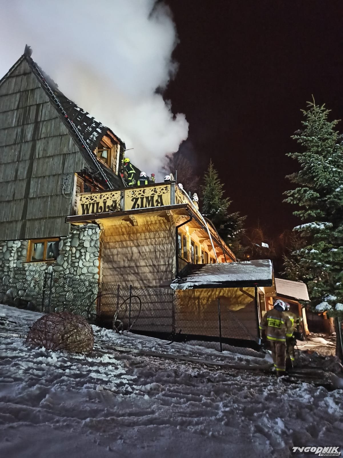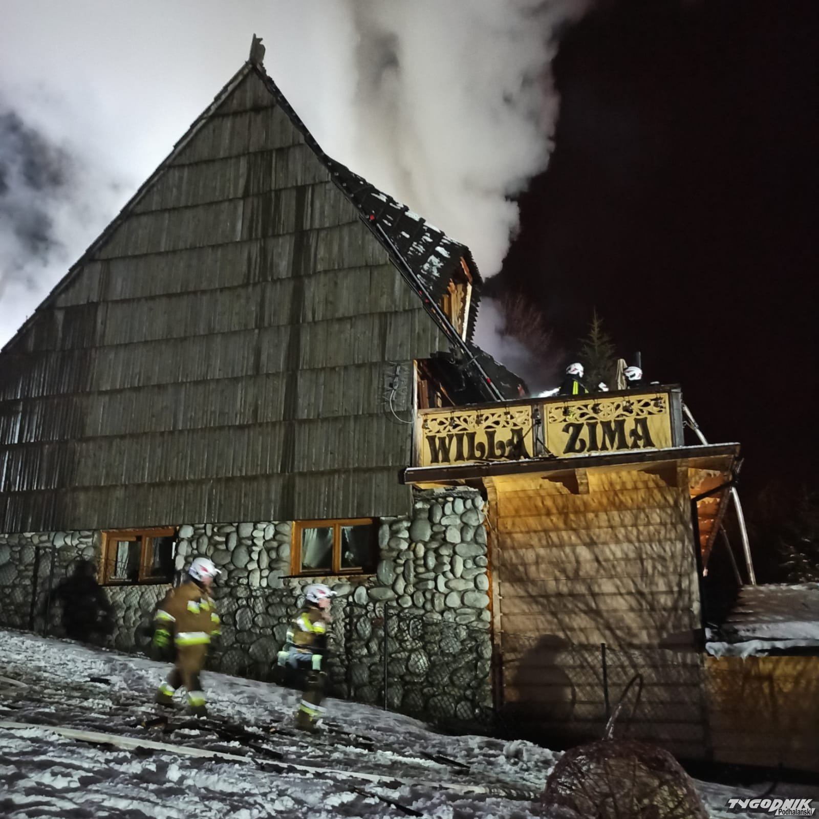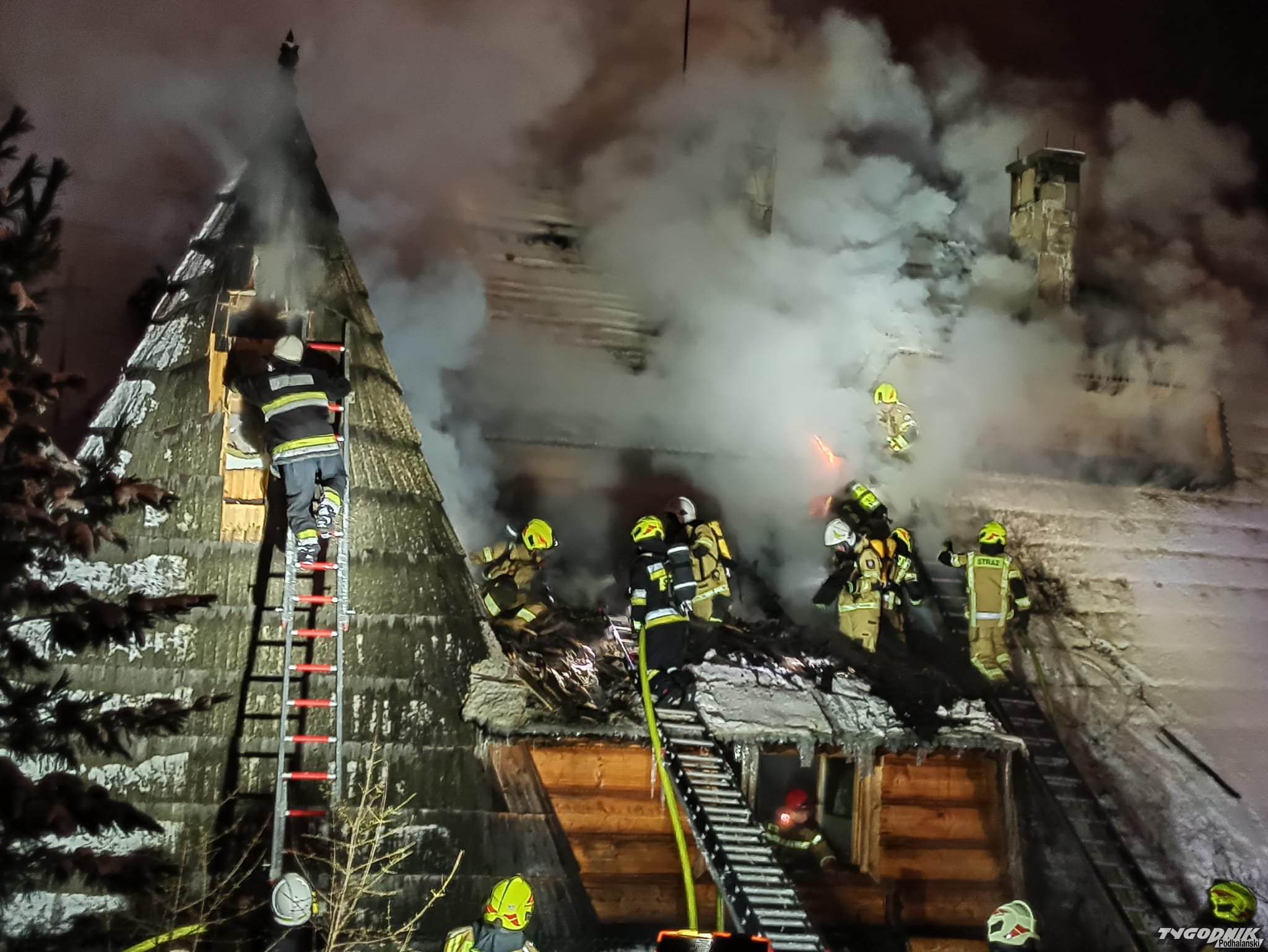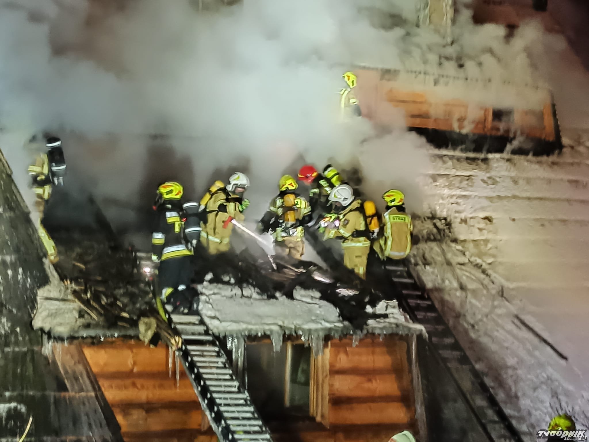 Pożar wybuchł przed szesnastą w jednym z budynków pensjonatowych przy ulicy Tatrzańskiej. Płomienie pojawiły się na wyższej kondygnacji krytego gontem budynku. Strażacy rozbierają pokrycie dachowe by dostać się do zarzewia ognia. Na miejsce przybyły jednostki z Zakopanego, Bukowiny Tatrzańskiej i okolicznych miejscowości.