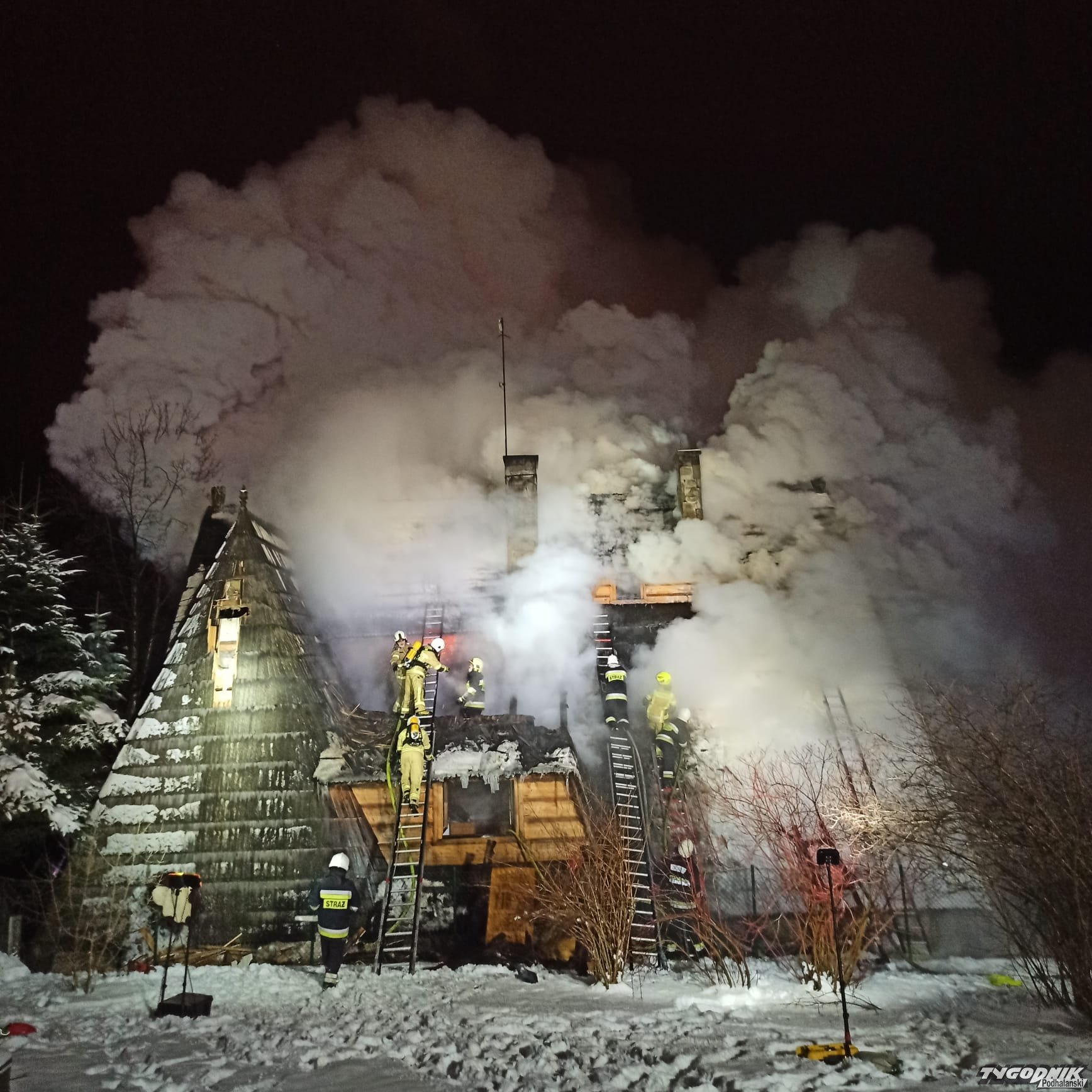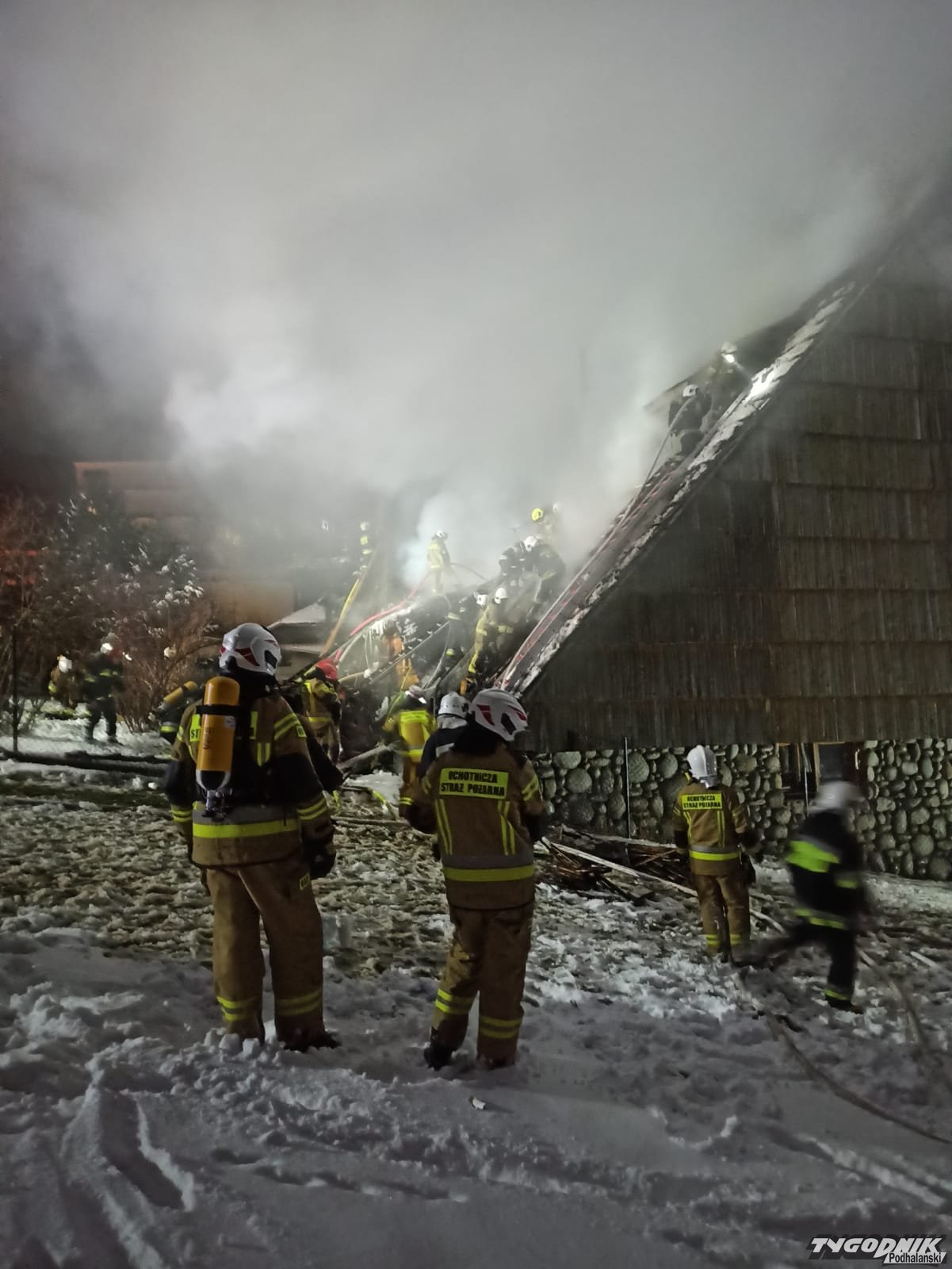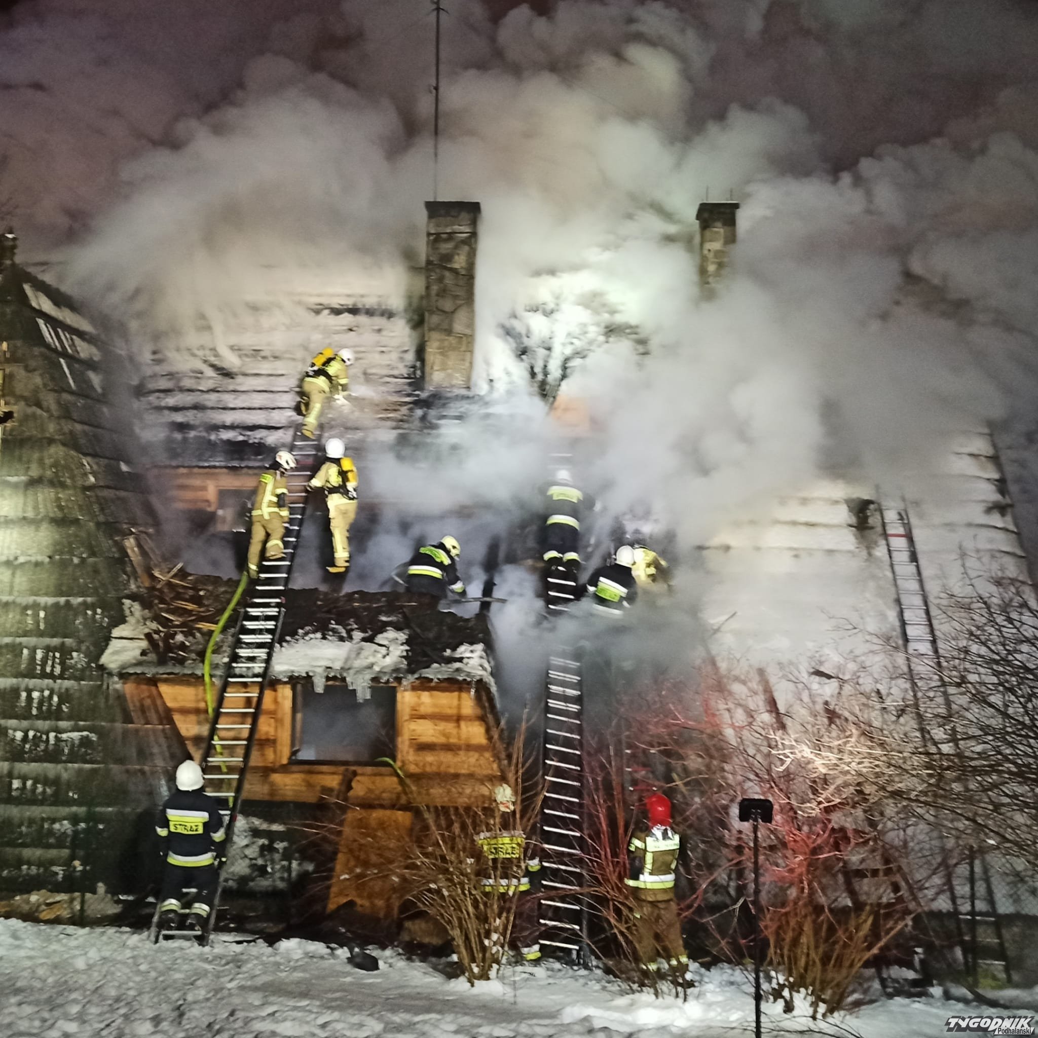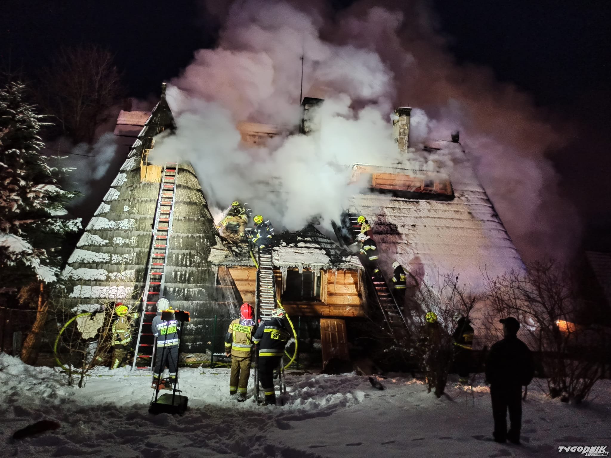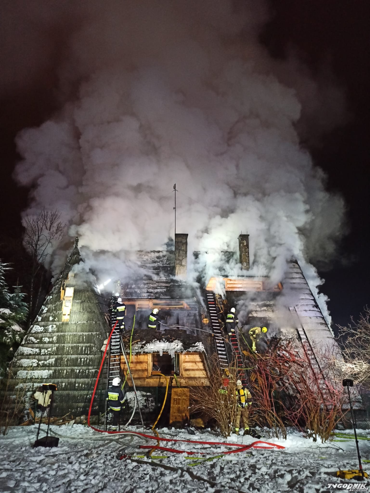 Pożar wybuchł przed szesnastą w jednym z budynków pensjonatowych przy ulicy Tatrzańskiej. Płomienie pojawiły się na wyższej kondygnacji krytego gontem budynku. Strażacy rozbierają pokrycie dachowe by dostać się do zarzewia ognia. Na miejsce przybyły jednostki z Zakopanego, Bukowiny Tatrzańskiej i okolicznych miejscowości.