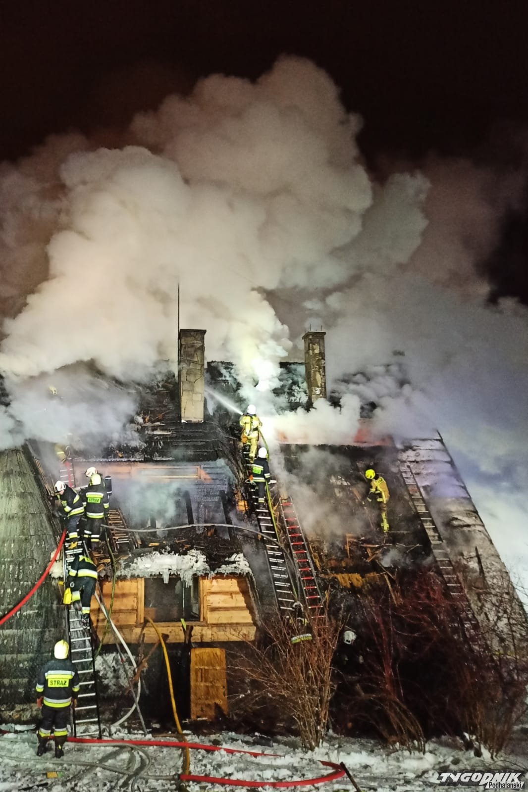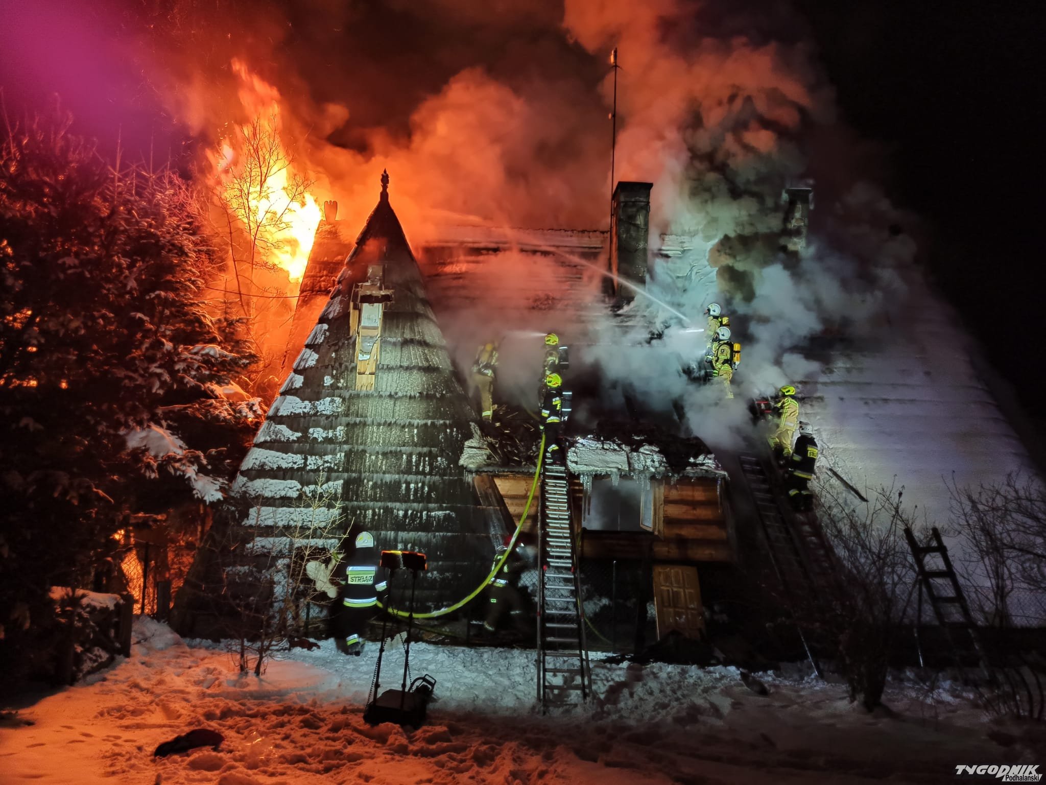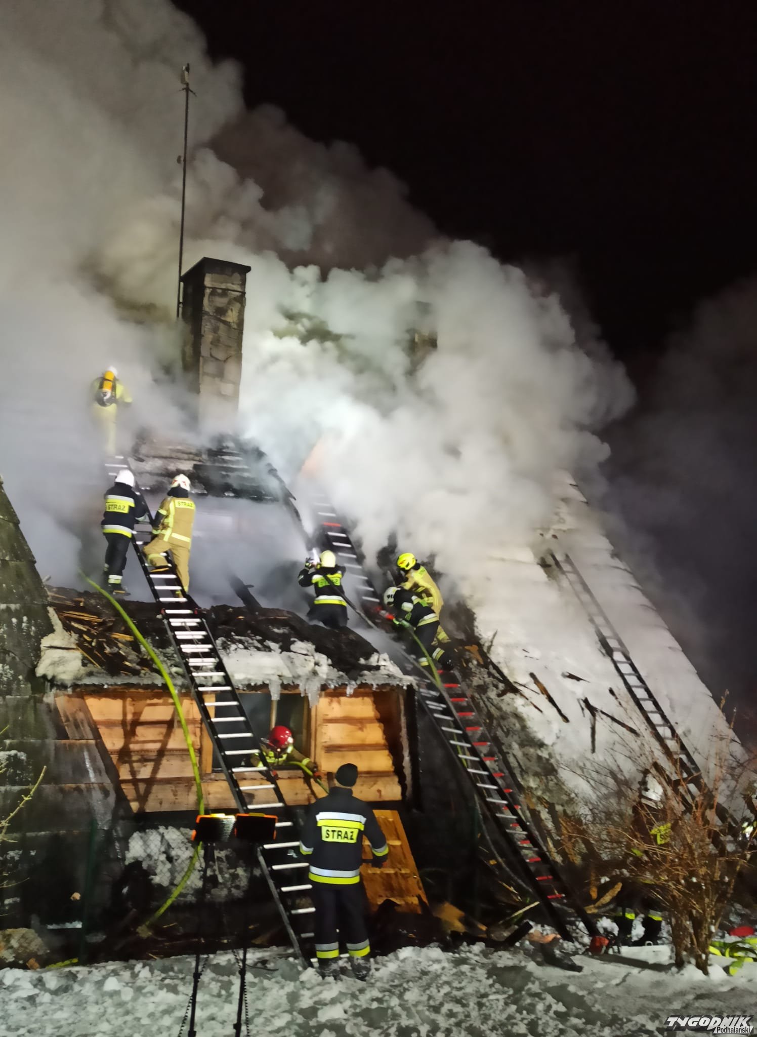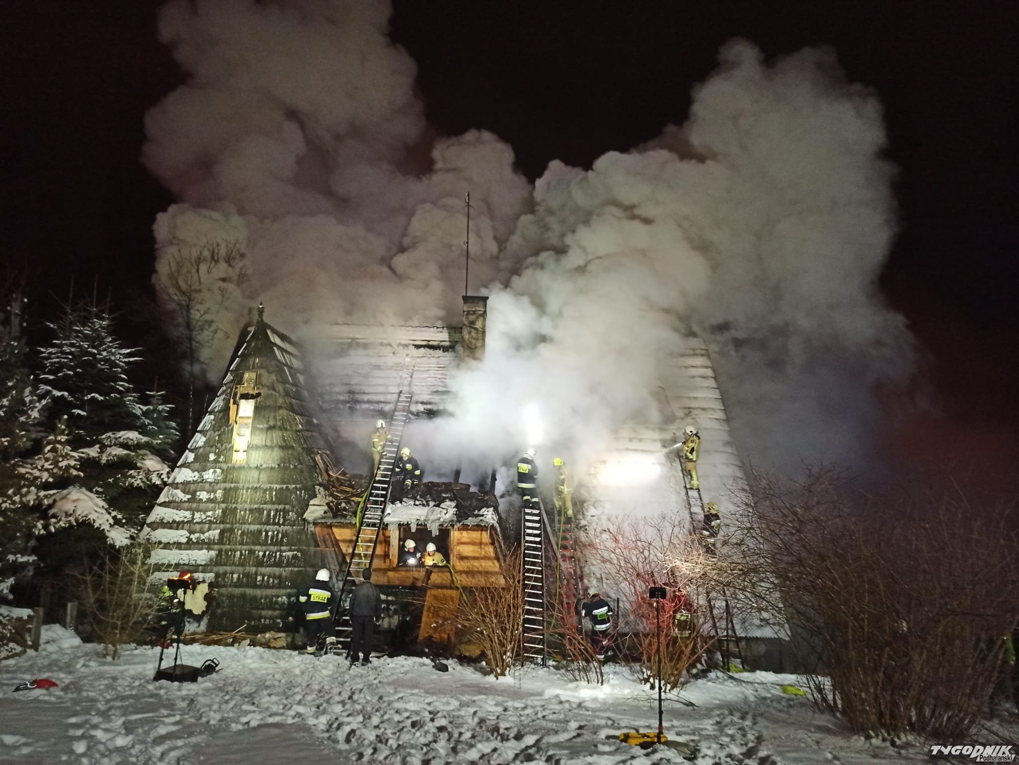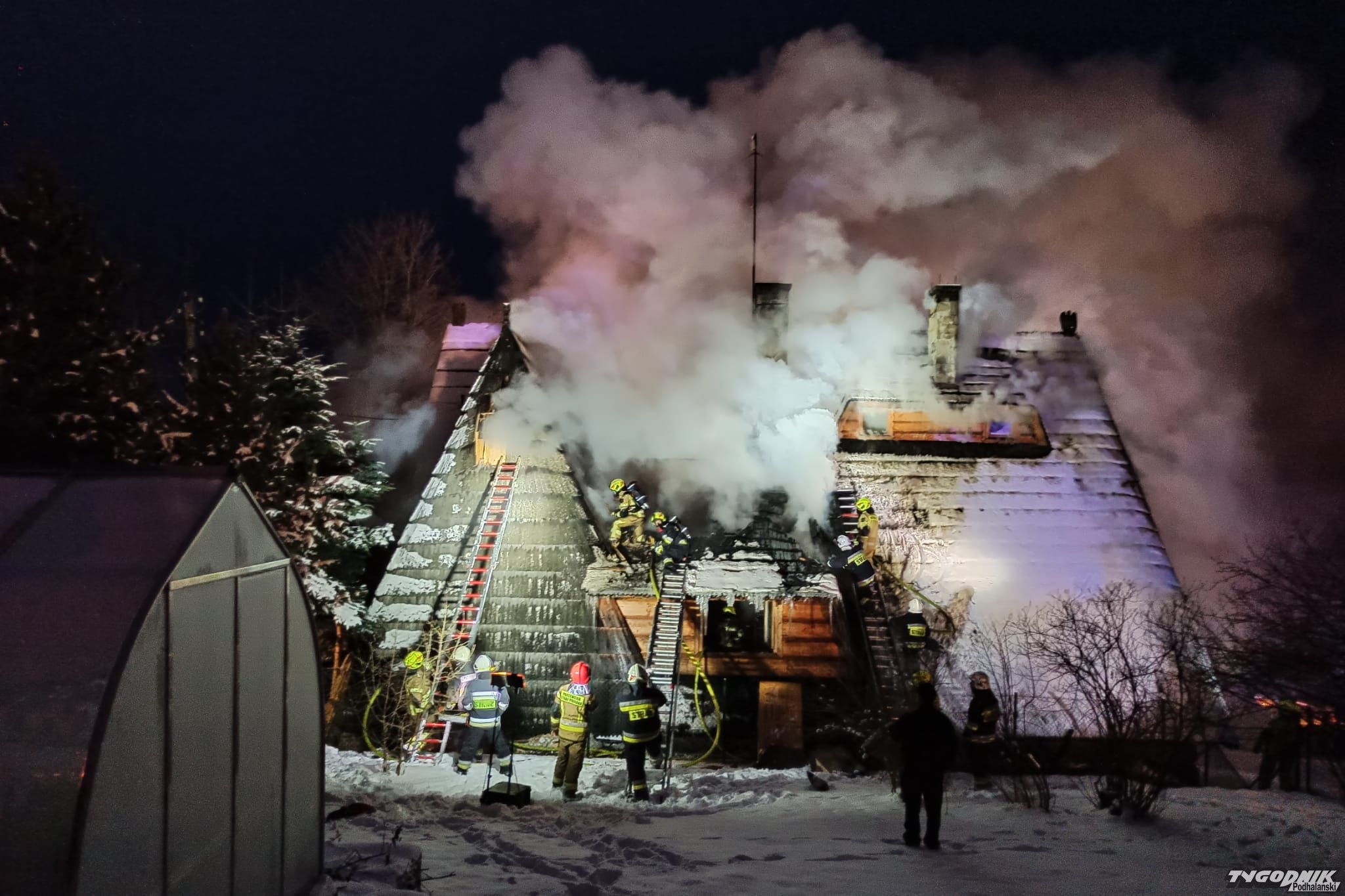 Pożar wybuchł przed szesnastą w jednym z budynków pensjonatowych przy ulicy Tatrzańskiej. Płomienie pojawiły się na wyższej kondygnacji krytego gontem budynku. Strażacy rozbierają pokrycie dachowe by dostać się do zarzewia ognia. Na miejsce przybyły jednostki z Zakopanego, Bukowiny Tatrzańskiej i okolicznych miejscowości.