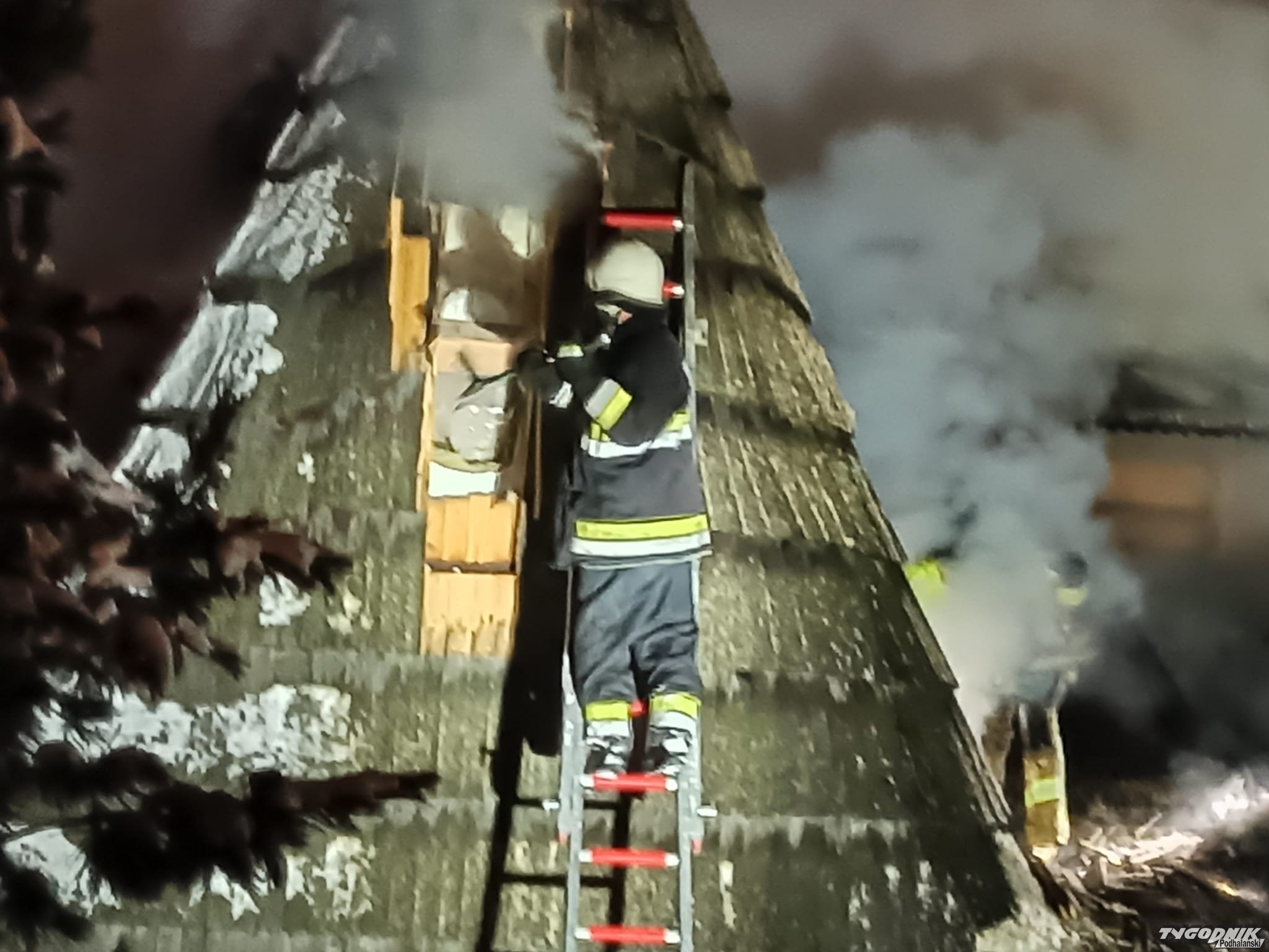 Strażacy rozbierają dach by dostać się do zarzewia pożaru.