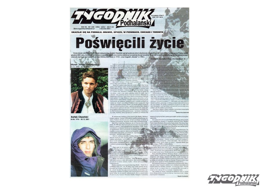 Pisząc artykuł, korzystałem z zamieszczonych w TP tekstów Adama Maraska oraz Jolanty Flach, Apoloniusza Rajwy i Marka Grocholskiego, opisujących przebieg wyprawy ratunkowej i uroczystości pogrzebowych.