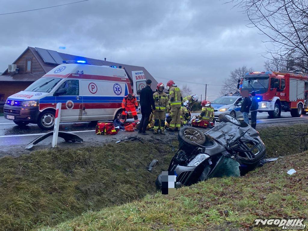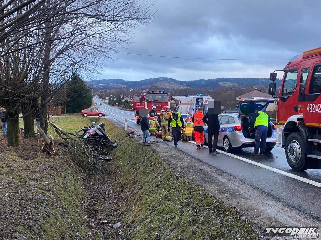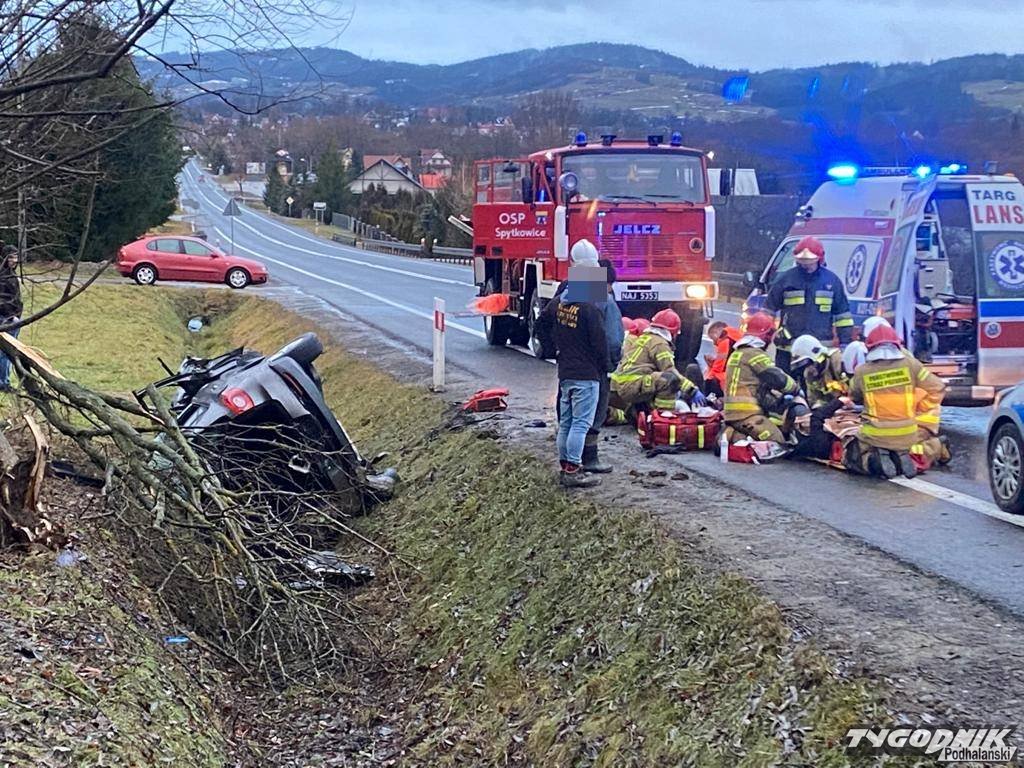 Wypadek zdarzył się około ósmej na krajowej siódemce, przy wyjeździe z Spytkowic w stronę Rabki. Kierowca auta osobowego jadąc w stronę Jabłonki na łuku drogi stracił panowanie nad kierownicą przejechał na lewy pas a następnie wypadł z drogi. Auto wpadło do głębokiego rowu. Jest poważnie uszkodzone. Samochodem podróżowało kilka osób. Dwie są bardzo poważnie poszkodowane. Na miejscu rannych opatrują załogi karetek pogotowia.