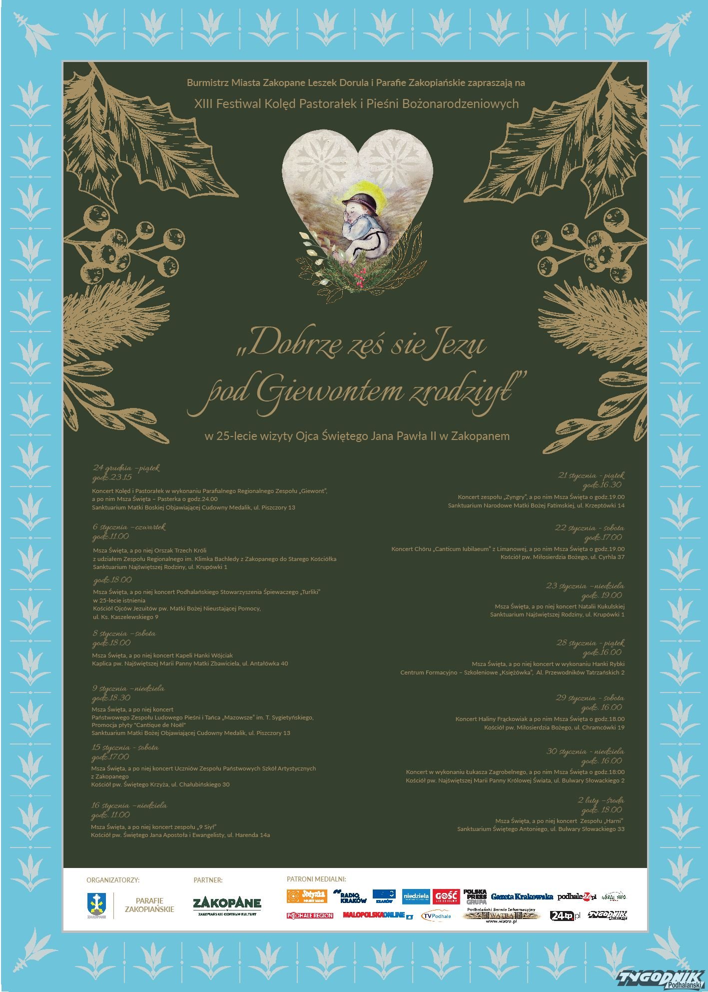 W niedzielę zaś (9.01) koncert Państwowego Zespołu Ludowego Pieśni i Tańca „Mazowsze” im. T. Sygietyńskiego, który zaprasza wszystkich w podróż, za przewodnika mając kolędę. Usłyszymy ich po mszy o godz. 18 w sanktuarium Matki Bożej Objawiającej Cudowny Medalik (ul. Piszczory 13). W trakcie koncertu wykonają najpiękniejsze polskie kolędy i pastorałki, oraz pieśni bożonarodzeniowe z różnych stron świata, które znalazły się na ich najnowszej płycie. Dzięki nim słuchacze odwiedzą daleką Islandię, śnieżną Norwegię, tradycyjną Rosję i Ukrainę, radosne Stany Zjednoczone, a także Austrię, Francję czy Niemcy.