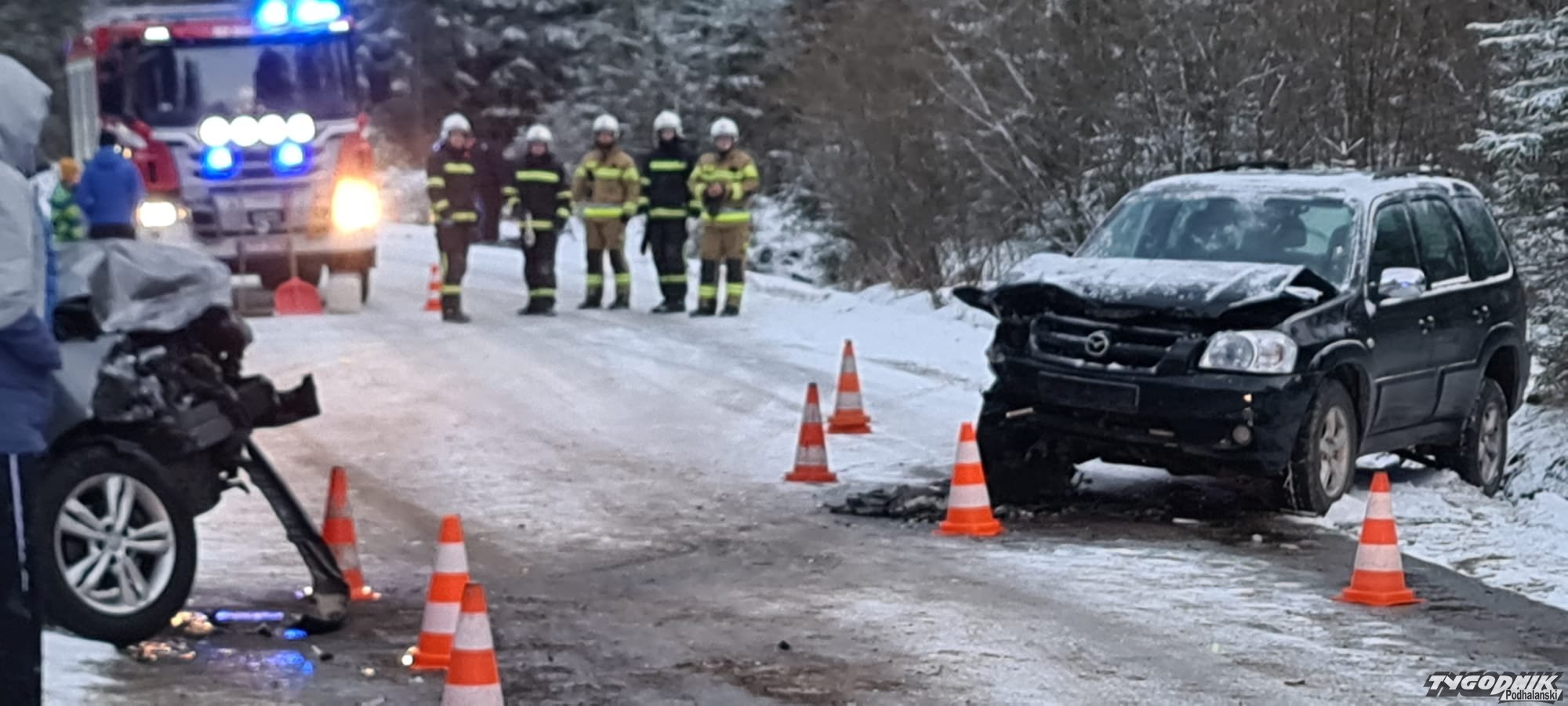 Czołowo zderzyły się hyunday z mazdą. Na miejscu pracują służby, trwa badanie przyczyn zderzenia i usuwanie skutków, droga przez długi czas była całkowicie zablokowana. Na jezdni jest bardzo ślisko, kierowcy mówią o "szklance". Samochody są poważnie uszkodzone. Nie mamy informacji, by ktoś poważniej ucierpiał.