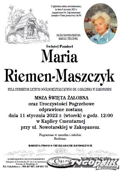 W wieku 84 lat zmarła Maria Riemen-Maszczyk, była dyrektor Liceum Ogólnokształcącego im. Oswalda Balzera w Zakopanem
