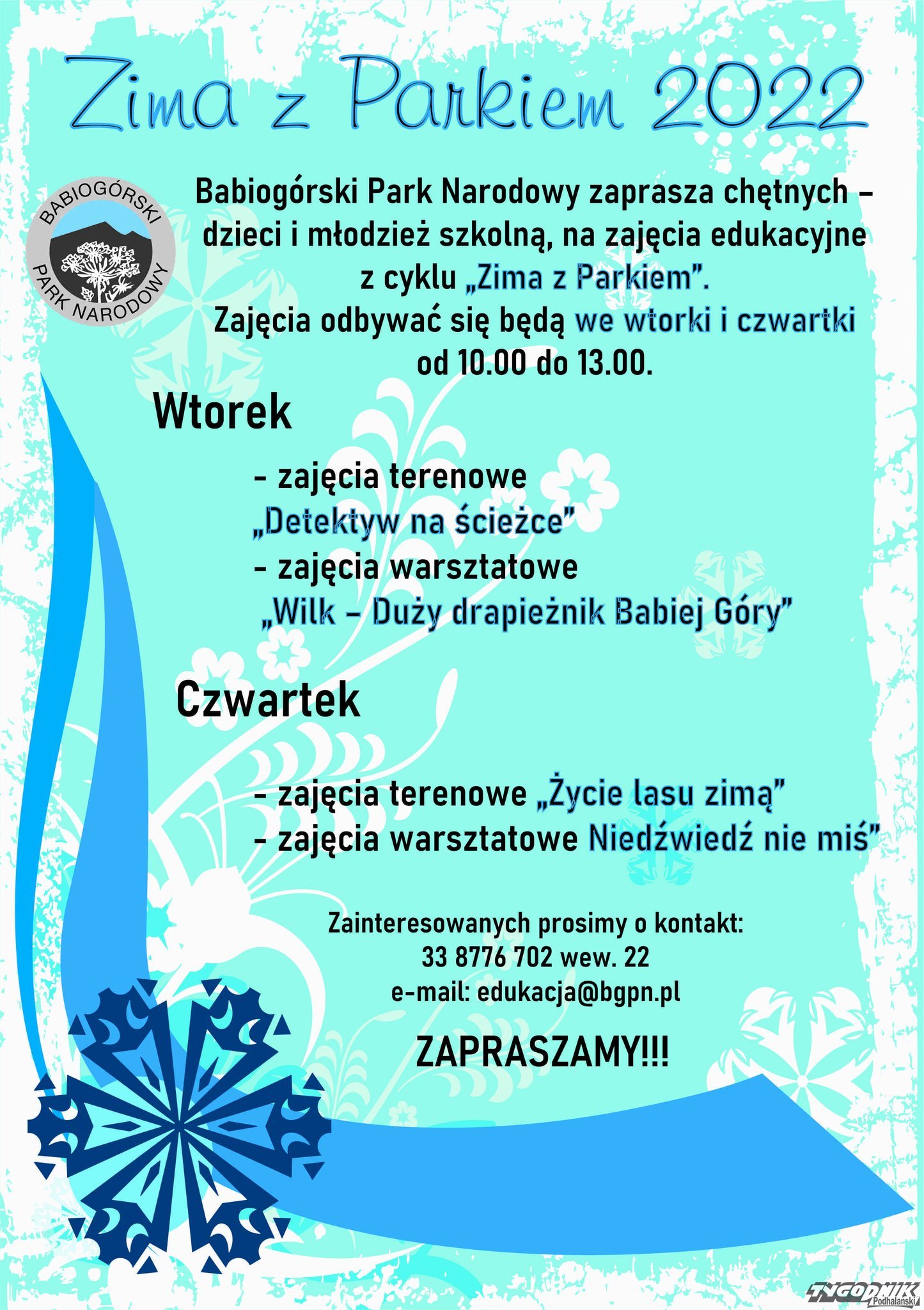 Babiogórski Park Narodowy zaprasza dzieci i młodzież szkolną na zajęcia edukacyjne z cyklu „Zima z Parkiem”. Zajęcia odbywać się będą podczas ferii zimowych 2 razy w tygodniu: we wtorki i czwartki w godzinach 10 – 13.