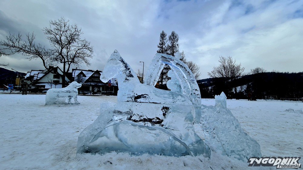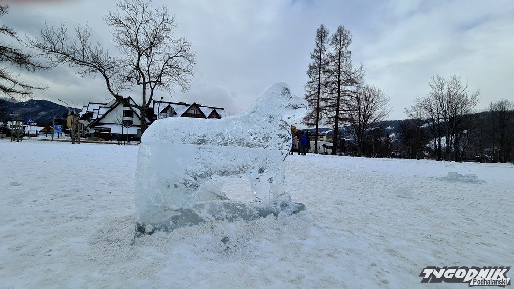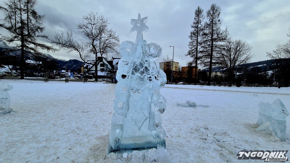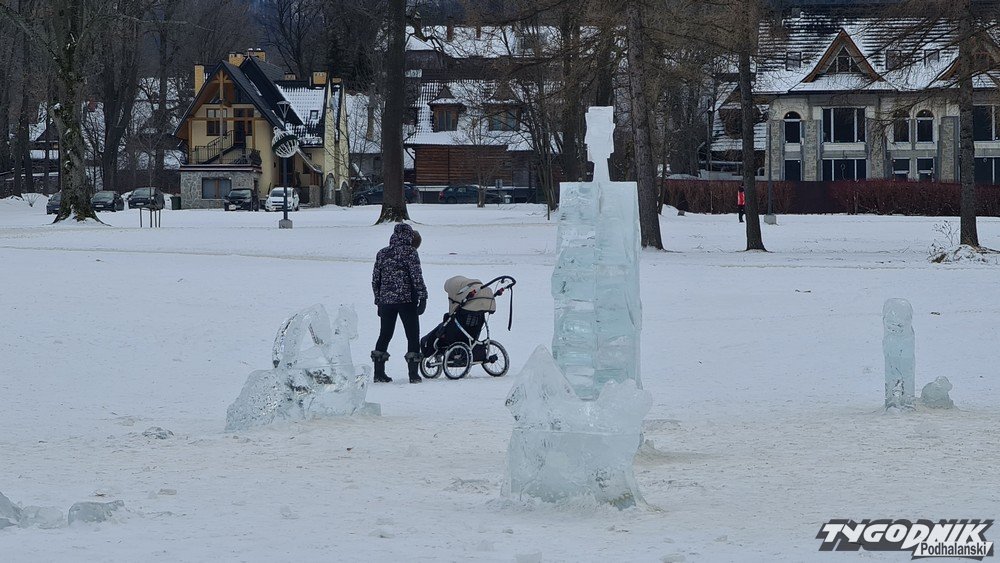 Turyści i zakopiańczycy spacerujący po Równi Krupowej mogą podziwiać lodowe rzeźby.