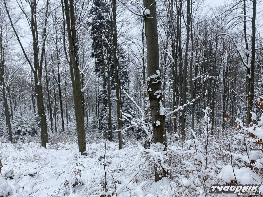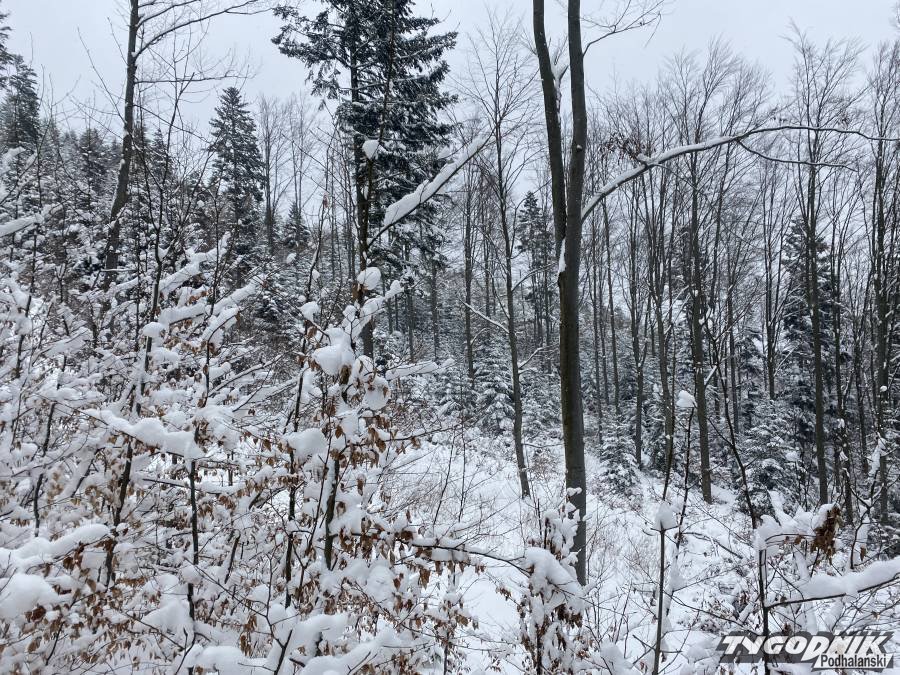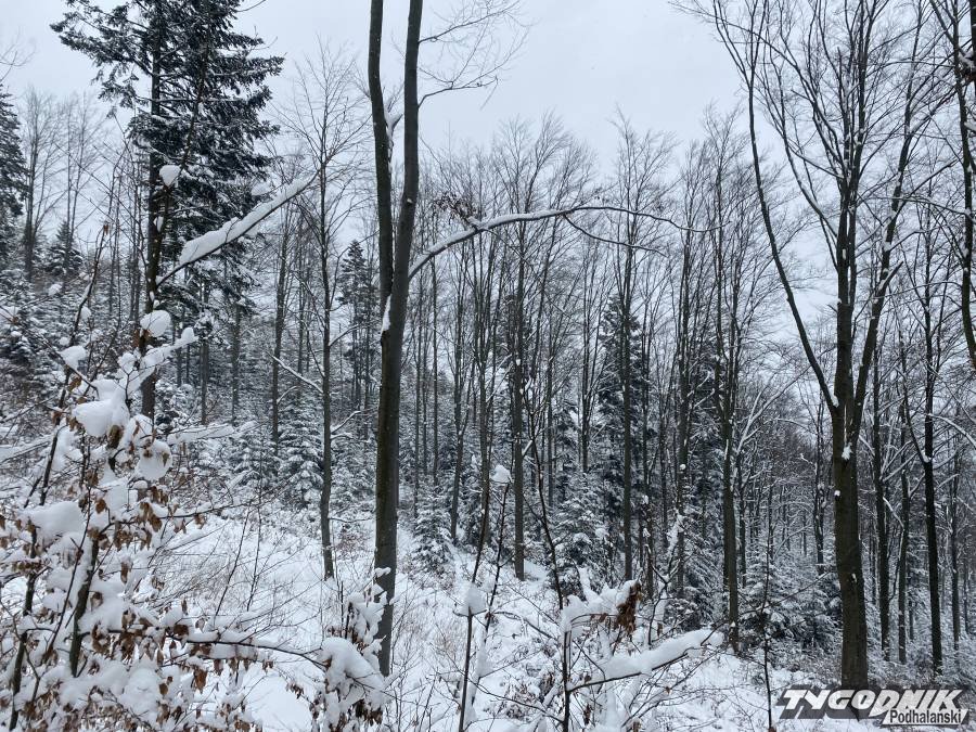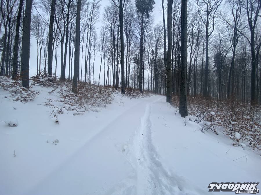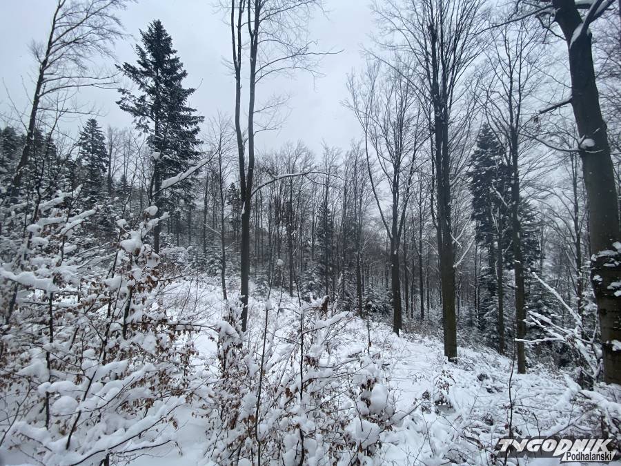 Tak urokliwie wyglądał dziś bukowy las na stokach Małej Góry w Beskidzie wyspowym. Lesne dukty przykrywa kilku dziesięciocentymetrowa biała pokrywa. Panuje lekki mróz a w wyższych położeniach trosze wieje. Pogoda na spacer wymarzona, choć przedzieranie się przez zaspy może być forsowne.