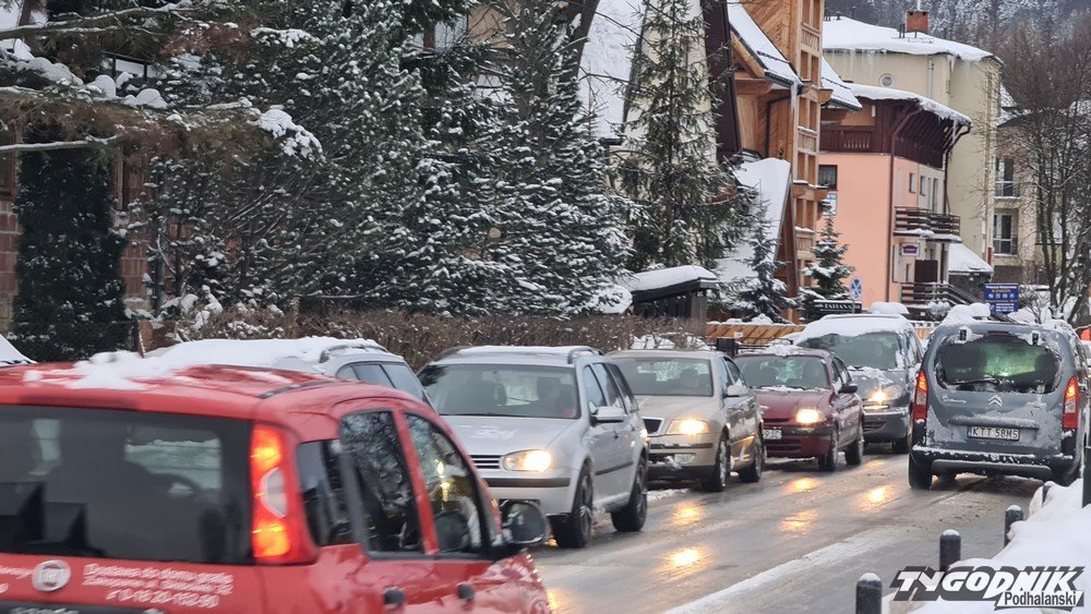 Mamy teraz ferie aż w sześciu województwach, w tym w woj. mazowieckim. To zawsze oznacza, że pod Giewontem obserwujemy turystyczny feryjny szczyt. Nie inaczej jest tym razem. Korkuje się wiele ulic pod Giewontem. Przejazd z Chłabówki na Krzeptówki zajmuje pół godziny, a to odcinek o długości 9 km. Zakorkowana jest także (na zdjęciu) ul. Makuszyńskiego.