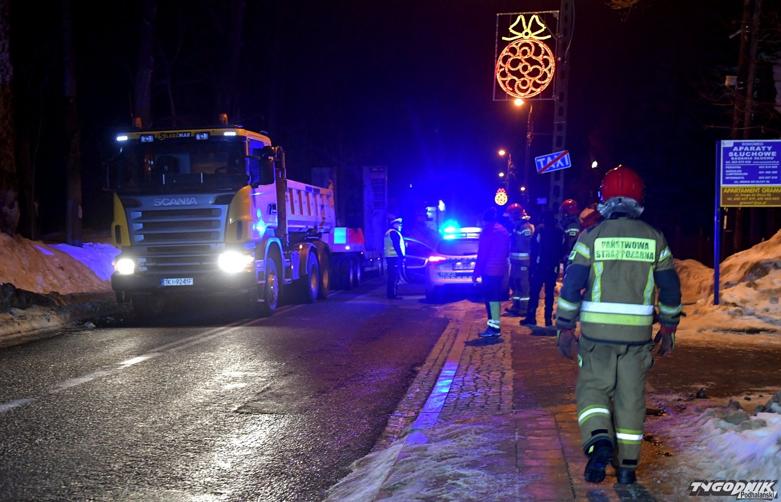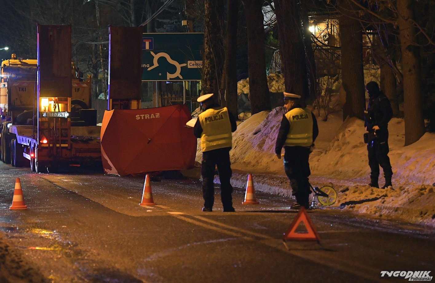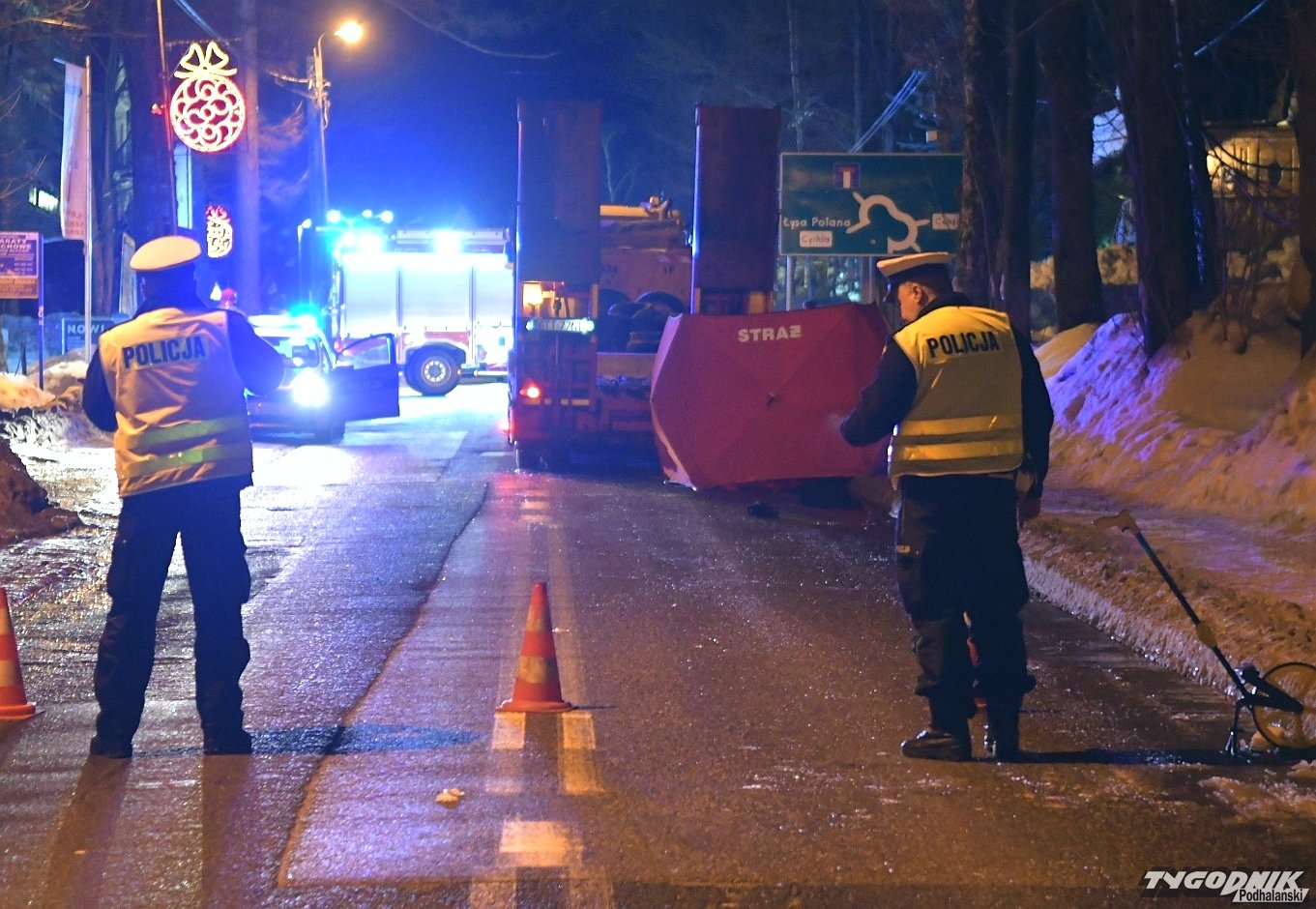 Na miejscu są strażacy i policjanci, którzy ustalają przebieg zdarzenia. Do tragicznego wypadku doszło niedaleko budynku Imperialu na Drodze do Olczy. Ciężarówka śmiertelnie potrąciła mężczyznę. Na drodze panują bardzo trudne warunki. W nocy temperatura spadła poniżej zera i zrobiło się bardzo ślisko. Do wypadku doszło poza przejściem dla pieszych. Przejazd przez Drogę do Olczy jest całkowicie zablokowany.