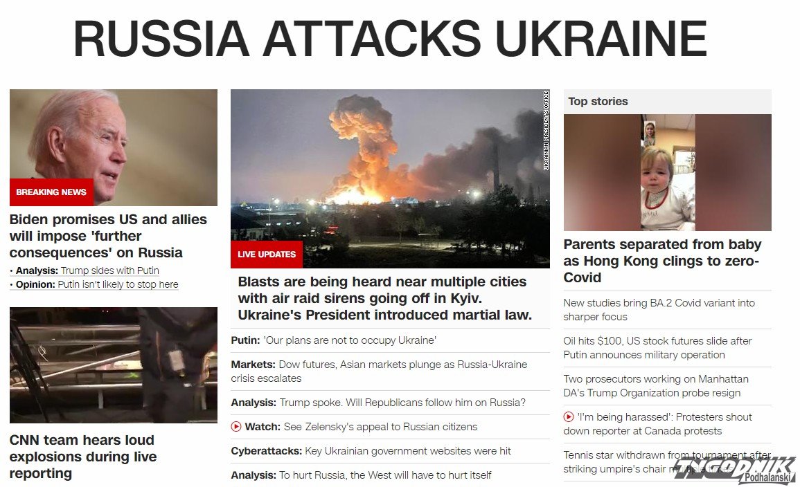 Słychać eksplozje w wielu ukraińskich miastach - donoszą media na całym świecie. Rosja zaatakowała m. in. bazę lotniczą w Charkowie, Odessę. Słychać także syreny alarmowe w Kijowie, mieszkańcy ewakuują się do schronów. - Świat musi działać natychmiast. Stawką jest przyszłość Europy i świata - napisał minister spraw zagranicznych Ukrainy Dmytro Kułeba. CNN informuje o setkach rannych w Kijowie. Ukraina wprowadziła stan wojenny. Trwa desant morski na Mariupol.