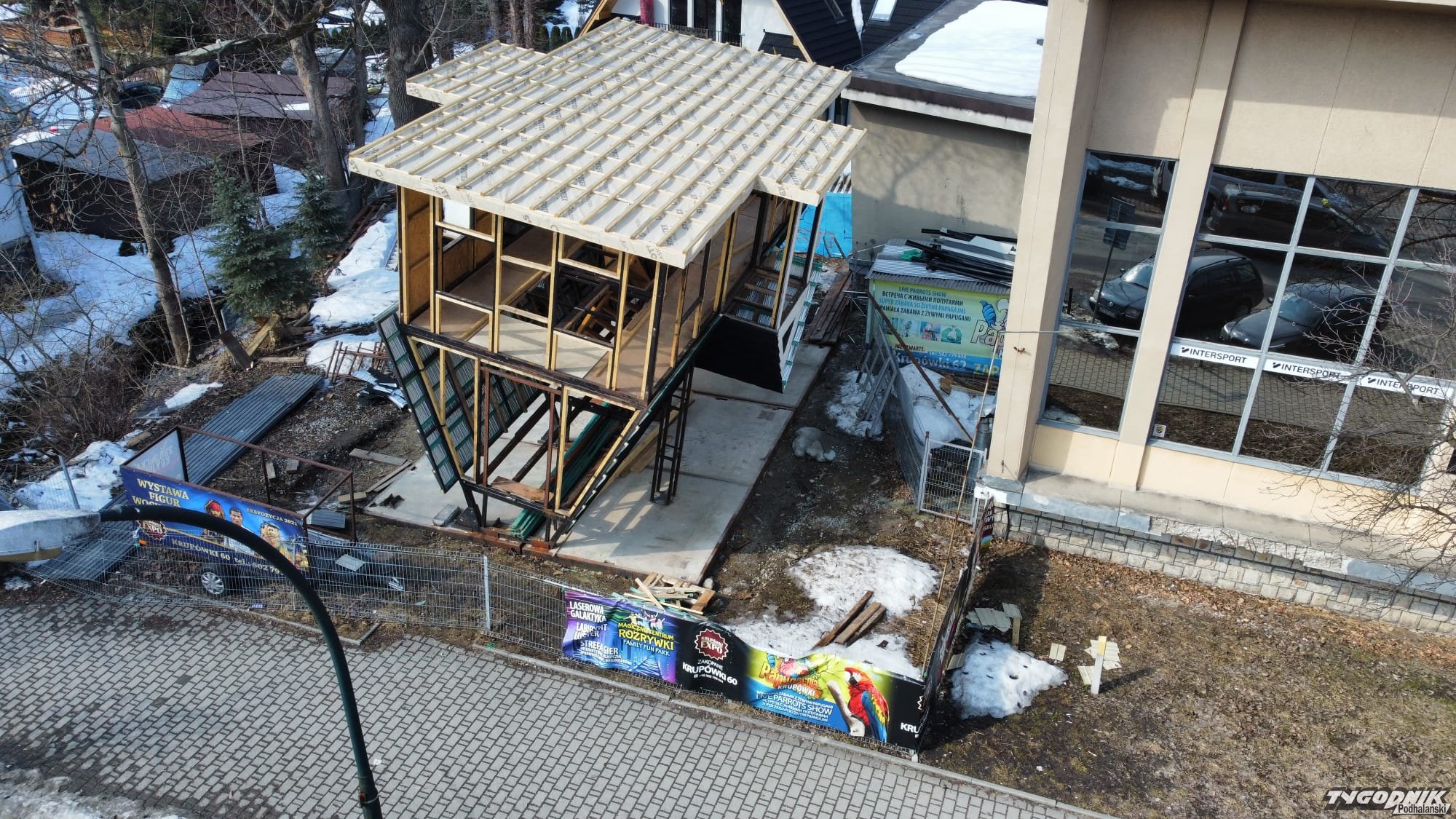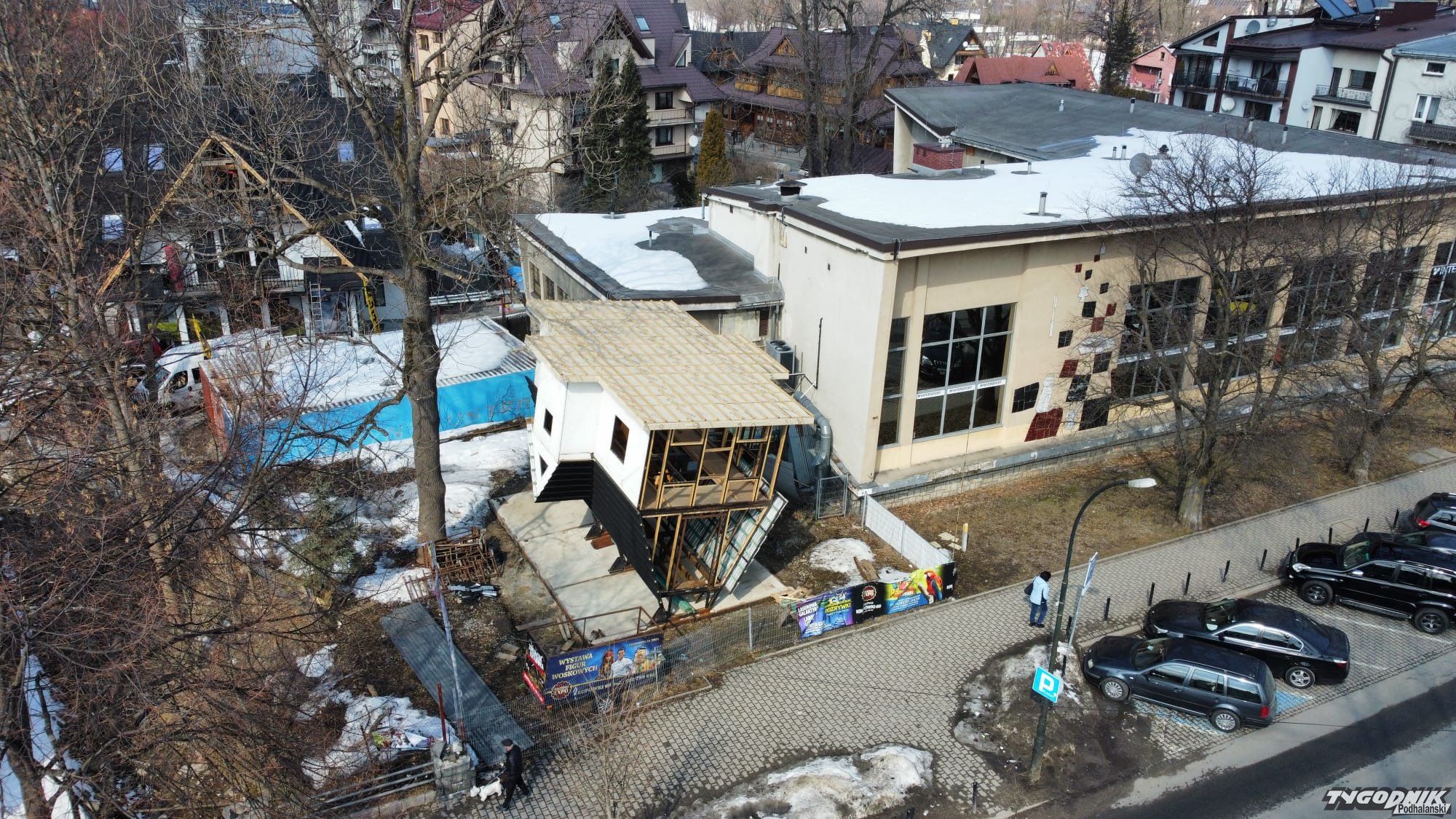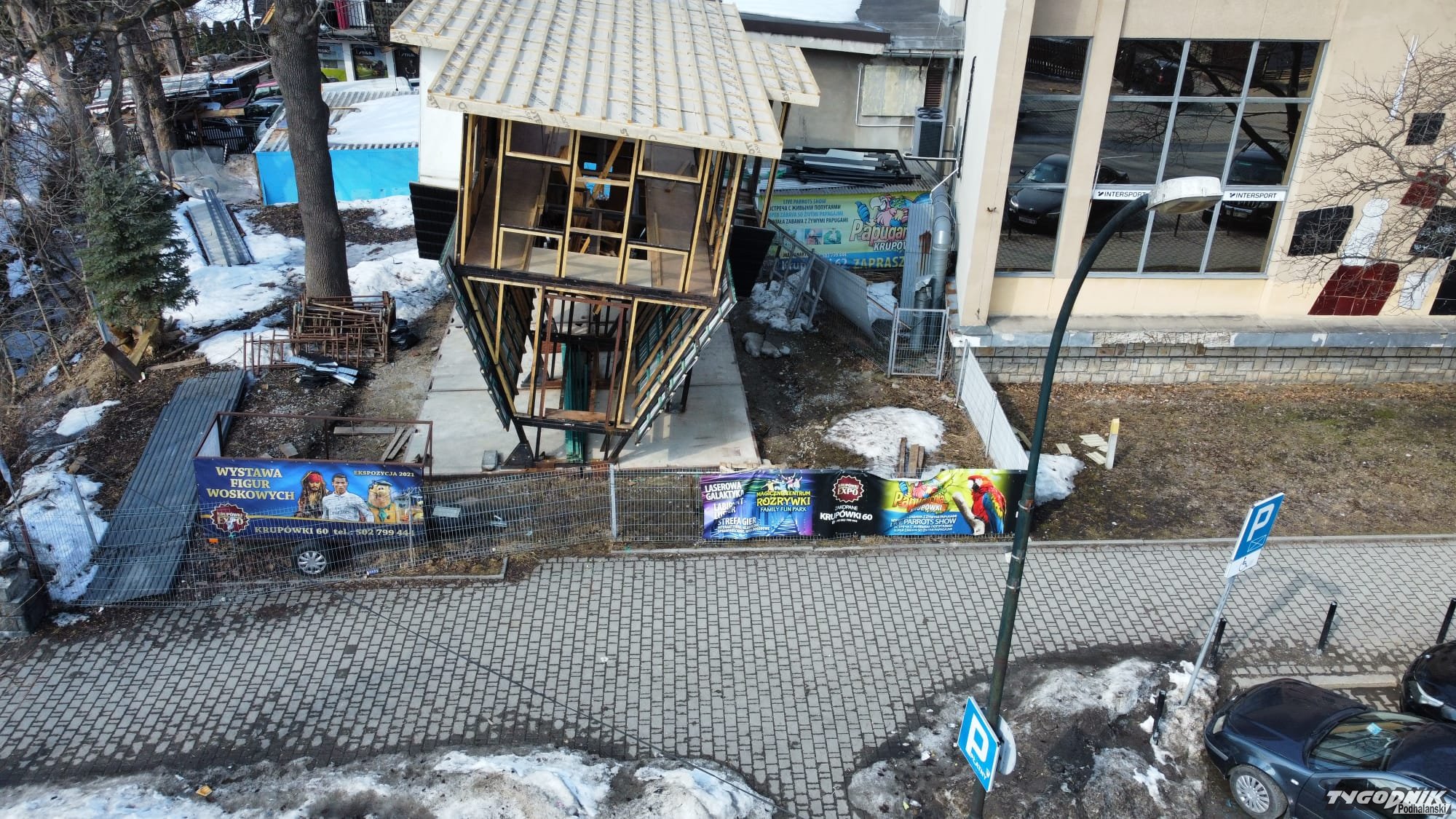 Rzut oka z góry na dom do góry nogami. Konstrukcja powstała z początkiem roku na tyłach budynku Wierchy przy ul. Krupówki 60