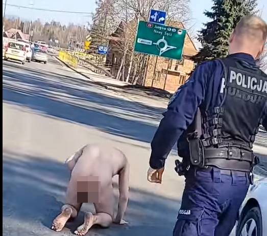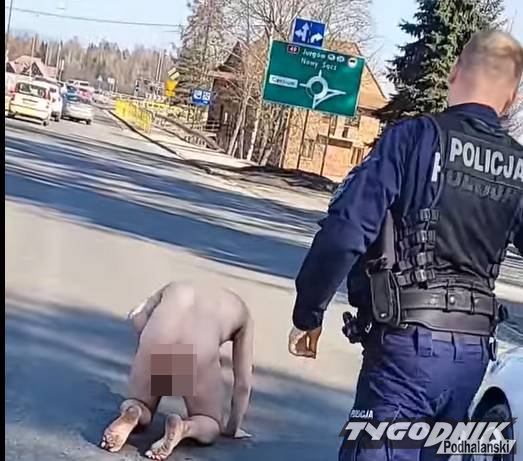Nagi mężczyzna biegał główną ulicą Nowego Targu