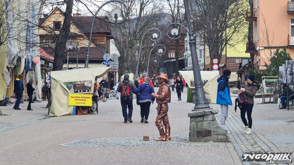 W Zakopanem turystów jak na lekarstwo, ale być może cieplejszy dzień sprawił, że na Krupówkach spotkaliśmy więcej osób niż jeszcze w poniedziałek. W najbliższych dniach nie będzie raczej turystycznego najazdu na Zakopane. Nie wiadomo też, jak będą wyglądać Święta Wielkanocne i Majówka. W obecnych czasach turyści rezerwują noclegi w ostatniej chwili. Kilkutygodniowe wyprzedzenie zdarza się naprawdę rzadko. Jest jednak i dobra wiadomość. Dziś na Krupówkach pojawił się mim, to zwykle oznacza, że przyjadą też turyści.