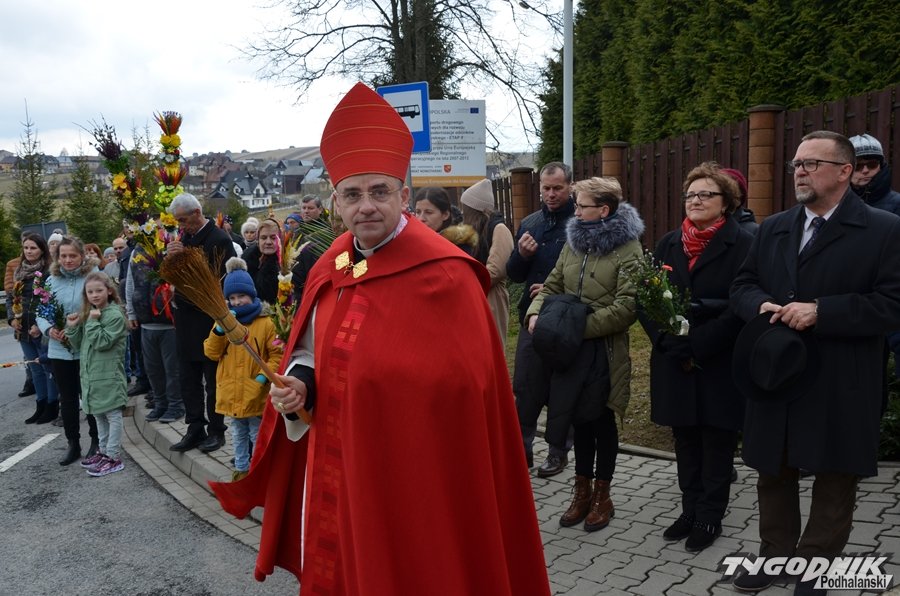Dzieci z palmowymi gałązkami czynnie uczestniczyły też we Mszy św., której przewodniczył wizytujący parafię ks. biskup Robert Chrząszcz.