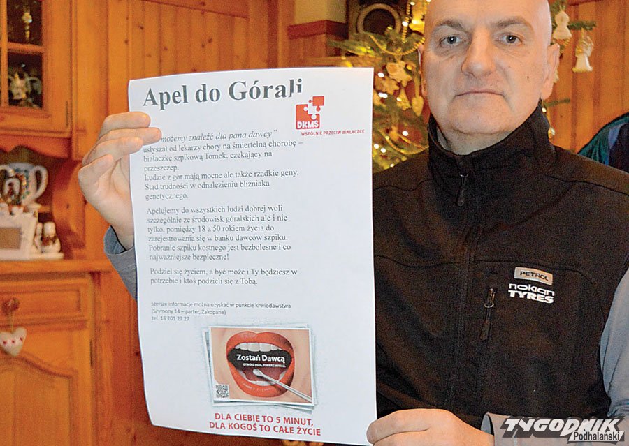 - Rozlepiam plakaty z apelem do górali, ponieważ my mamy silne geny, ale bardzo trudno znaleźć kogoś o zbliżonym typie genów - mówi Tomasz Gawlak. Swój apel przyniósł do naszej redakcji w Zakopanem. Jego syn rozwiózł plakaty do wszystkich zakopiańskich parafii. Dostał też zgodę od wielu przedsiębiorców, przyjaciół, znajomych, by plakat z apelem o rejestrację w banku dawców zawiesić w sklepach i restauracjach na Krupówkach. Pomocną dłoń wyciągnęły do niego także władze miasta i powiatu. - Im więcej nas będzie, im więcej ludzi uda się przekonać do badań, tym większe szanse, że w przyszłości uda się kogoś uratować. Dla dawcy to naprawdę niewielki trud. Jeśli okaże się, że możesz być dawcą szpiku, czeka cię wizyta w szpitalu. Tam siadasz przy specjalnej maszynerii, podpinają cię do niej i przez godzinę leżakujesz. W tym czasie twoja krew jest przepuszczona przez urządzenie, które odseparowuje potrzebną ilość szpiku. I tyle. Bez bólu, bez zagrożenia. Za darmo. W Polsce co godzinę ktoś dowiaduje się, że ma białaczkę, czyli nowotwór krwi. Tę diagnozę słyszą rodzice małych dzieci, młodzież, dorośli. Bez względu na wiek - każdy może zachorować. Mało ludzi zdaje sobie sprawę, że każdy może też pomóc. Bo dla wielu chorych jedyną szansą na życie jest przeszczepienie szpiku lub komórek macierzystych od niespokrewnionego dawcy