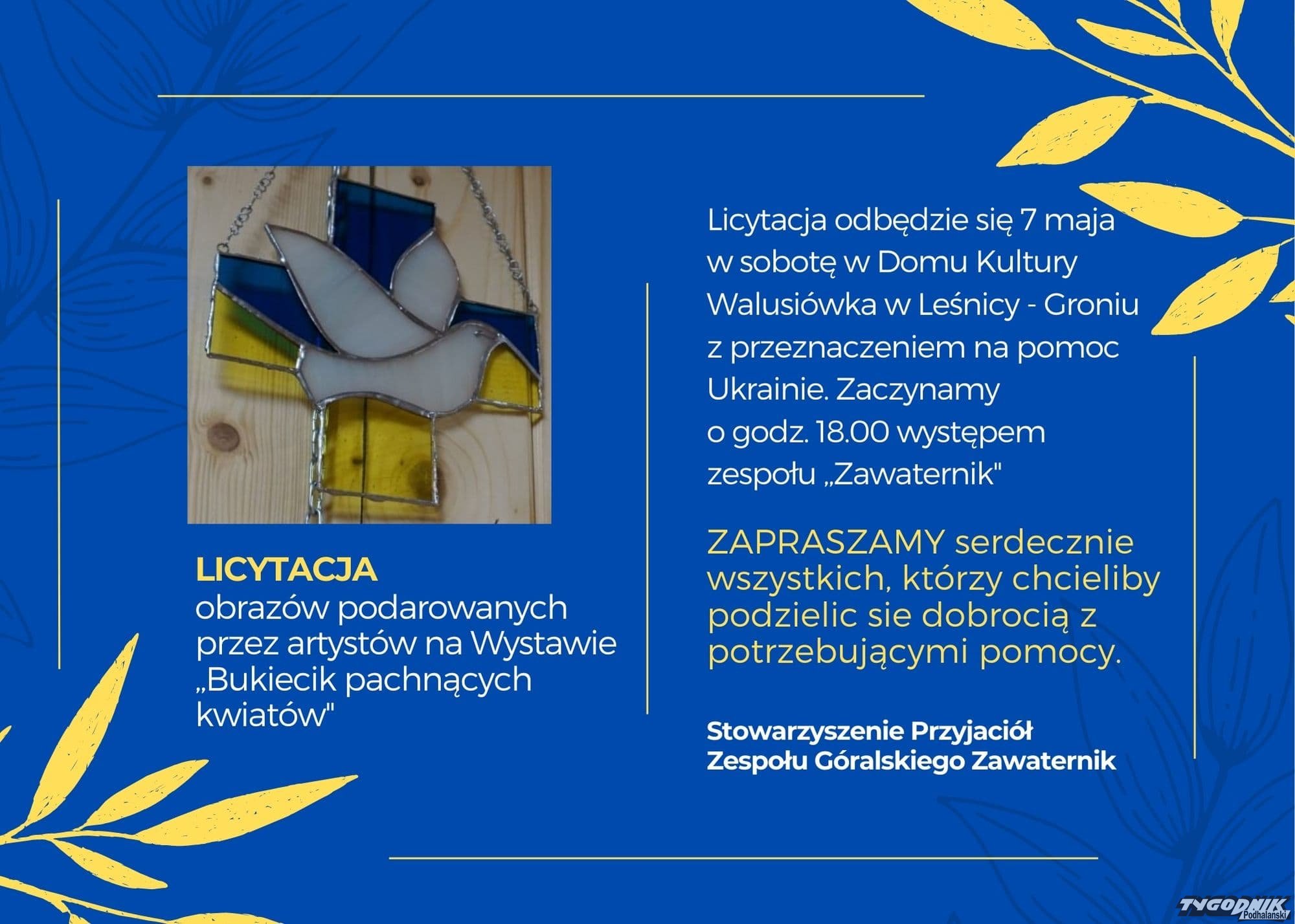 Wystawę ,,Bukiecik pachnących kwiatów" prezentującą prace twórców należących do Stowarzyszenia Artystów Pienińskich można było oglądać w Walusiówce przez cały kwiecień. Teraz każdy z twórców postanowił podarować jedną ze swoich prac na licytację. W ten sposób pod młotek pójdzie ok. 30 obrazów. Będzie można je zdobyć podczas akcji w Domu Ludowym Walusiówka w sobotę 7 maja. Początek o godz. 18.