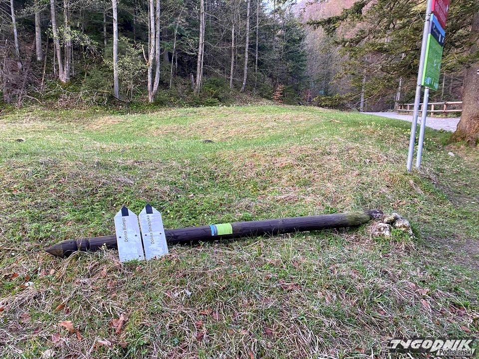 Ktoś zniszczył słup z tabliczkami Tatrzańskiego Parku Narodowego u wylotu Doliny Białego.