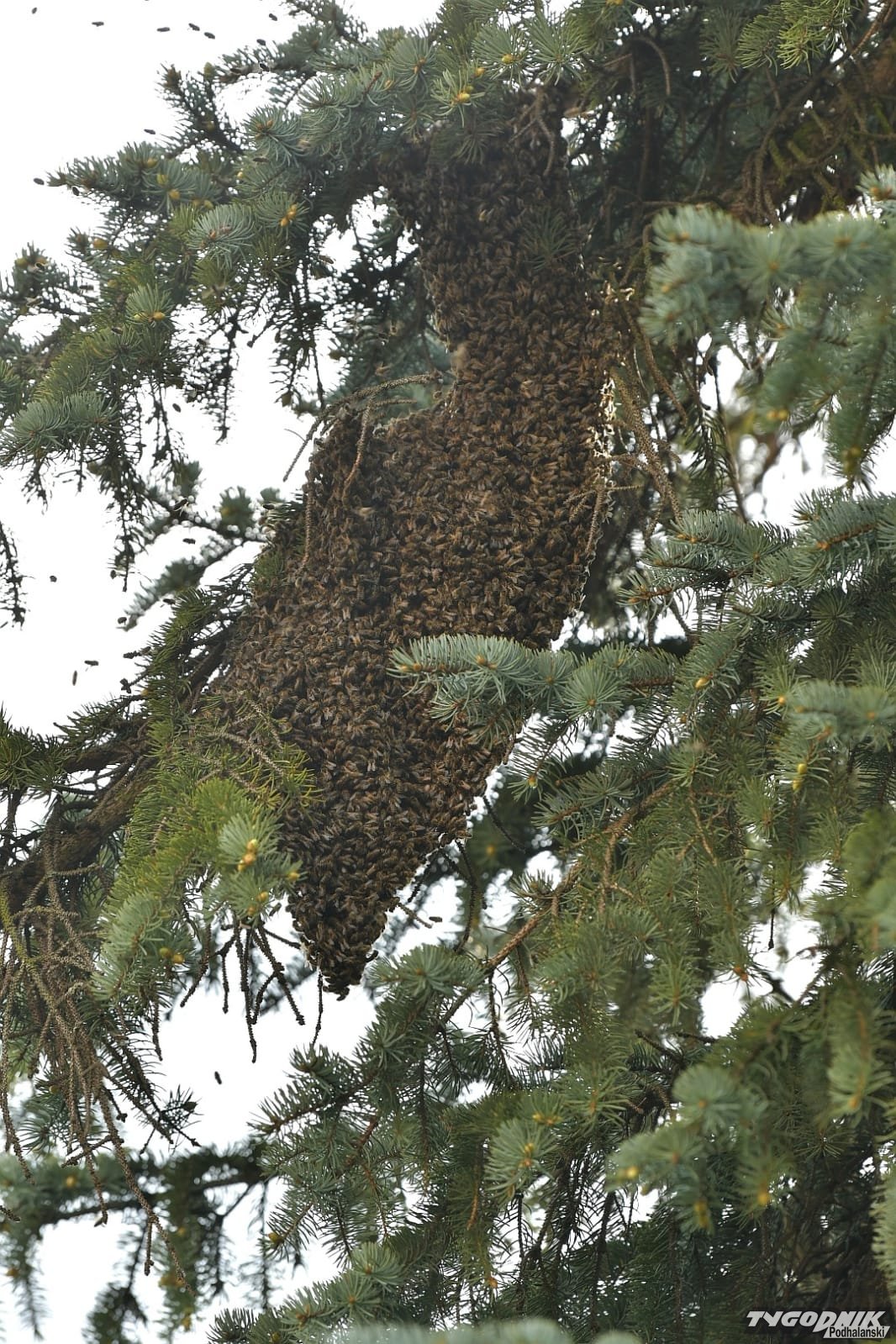 Rój pszczół zawieszony na drzewie między blokami