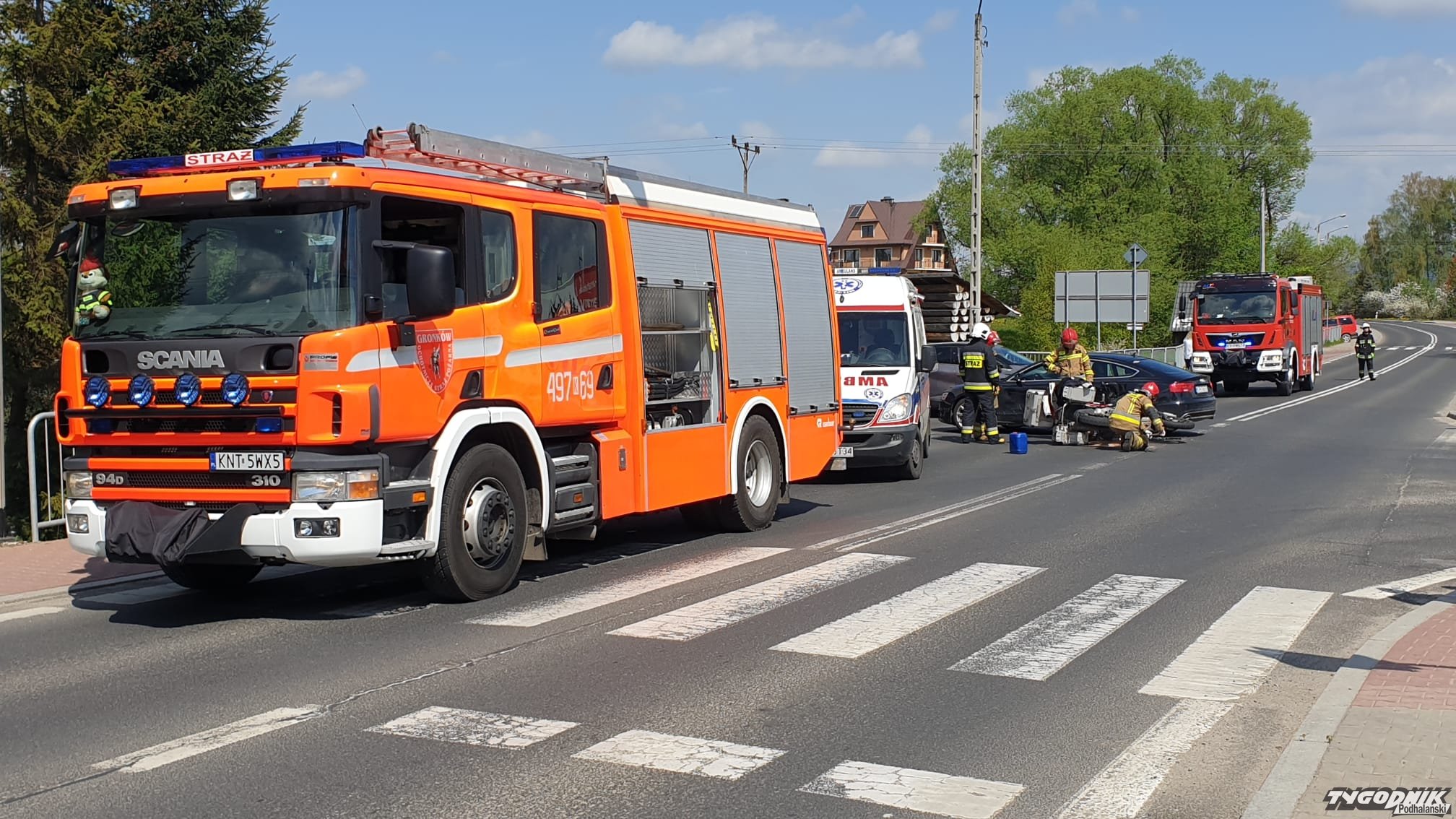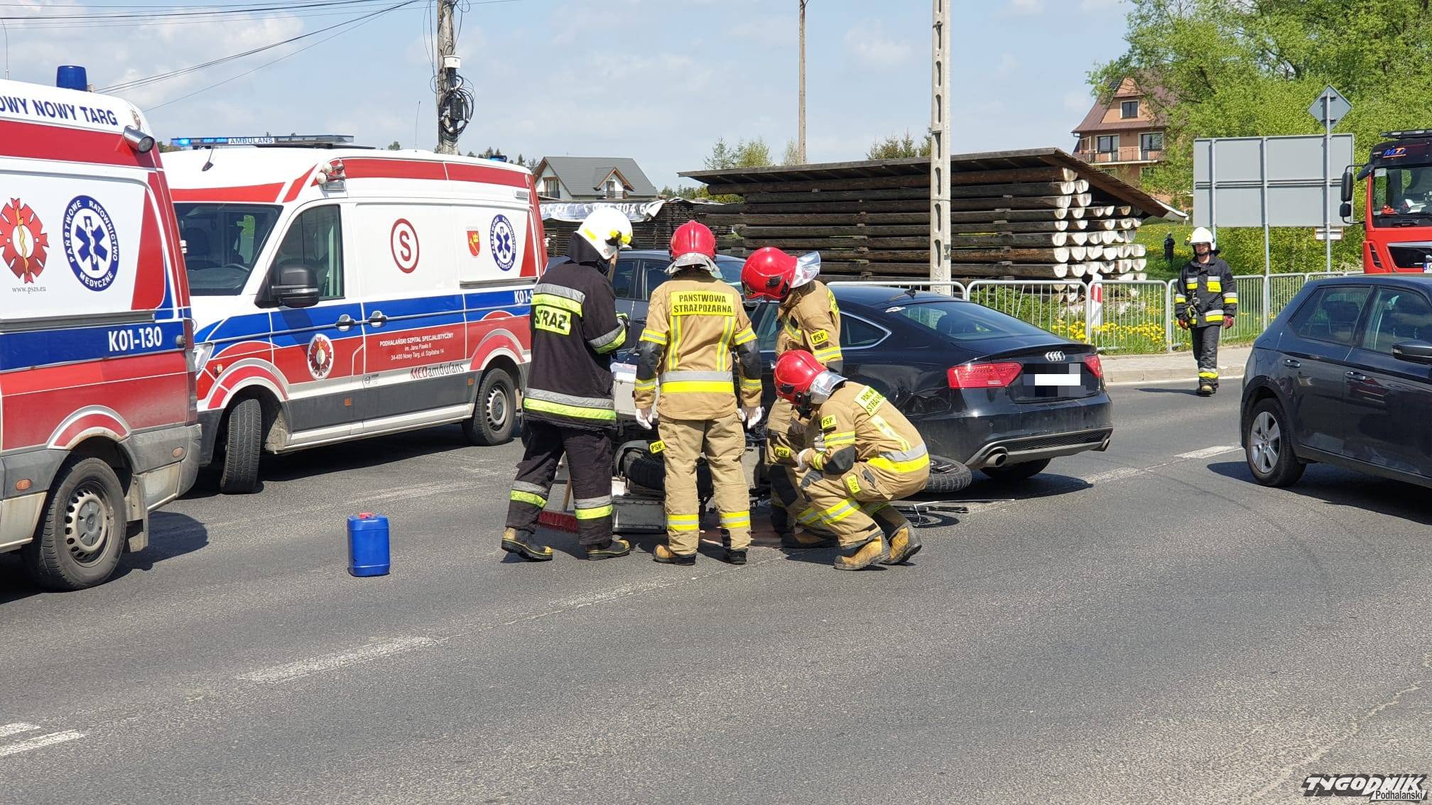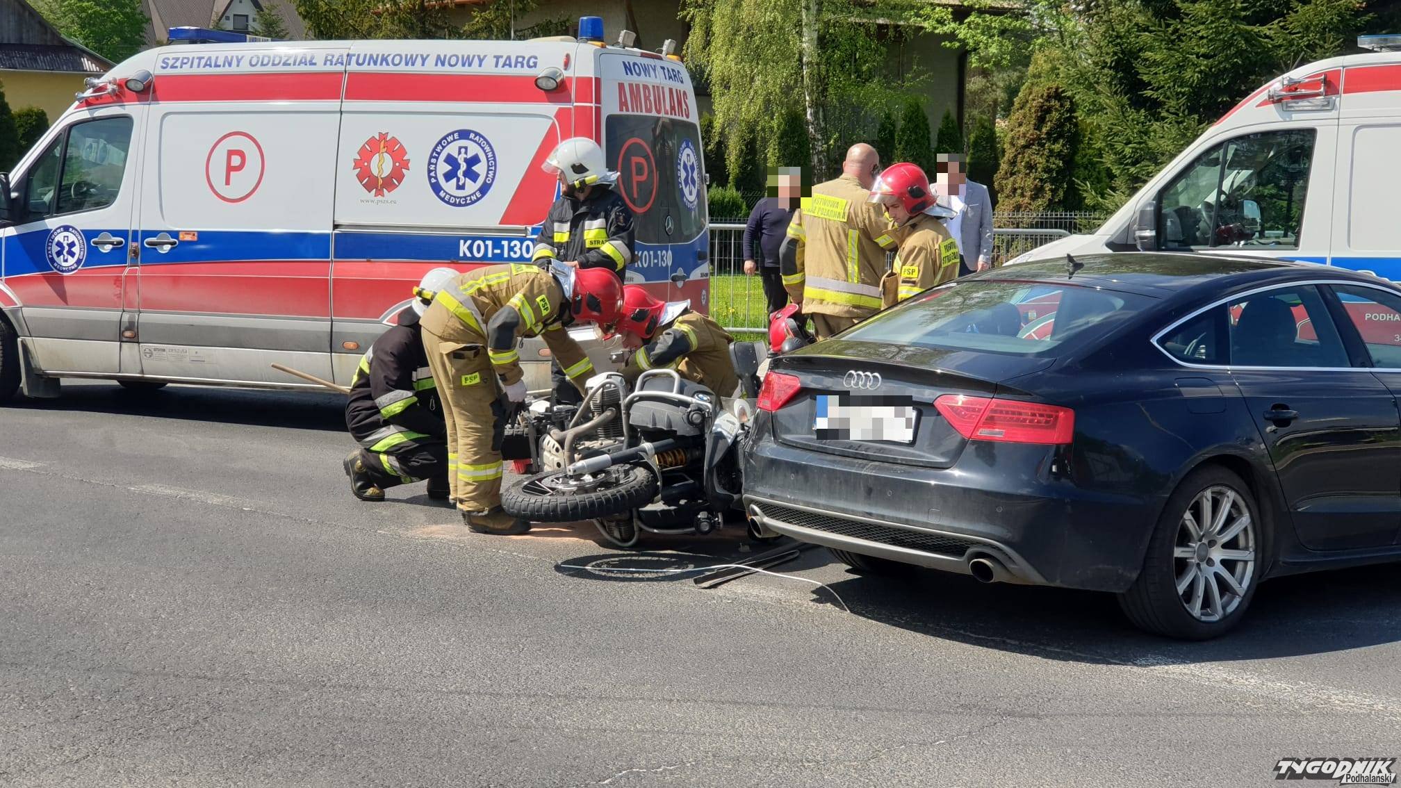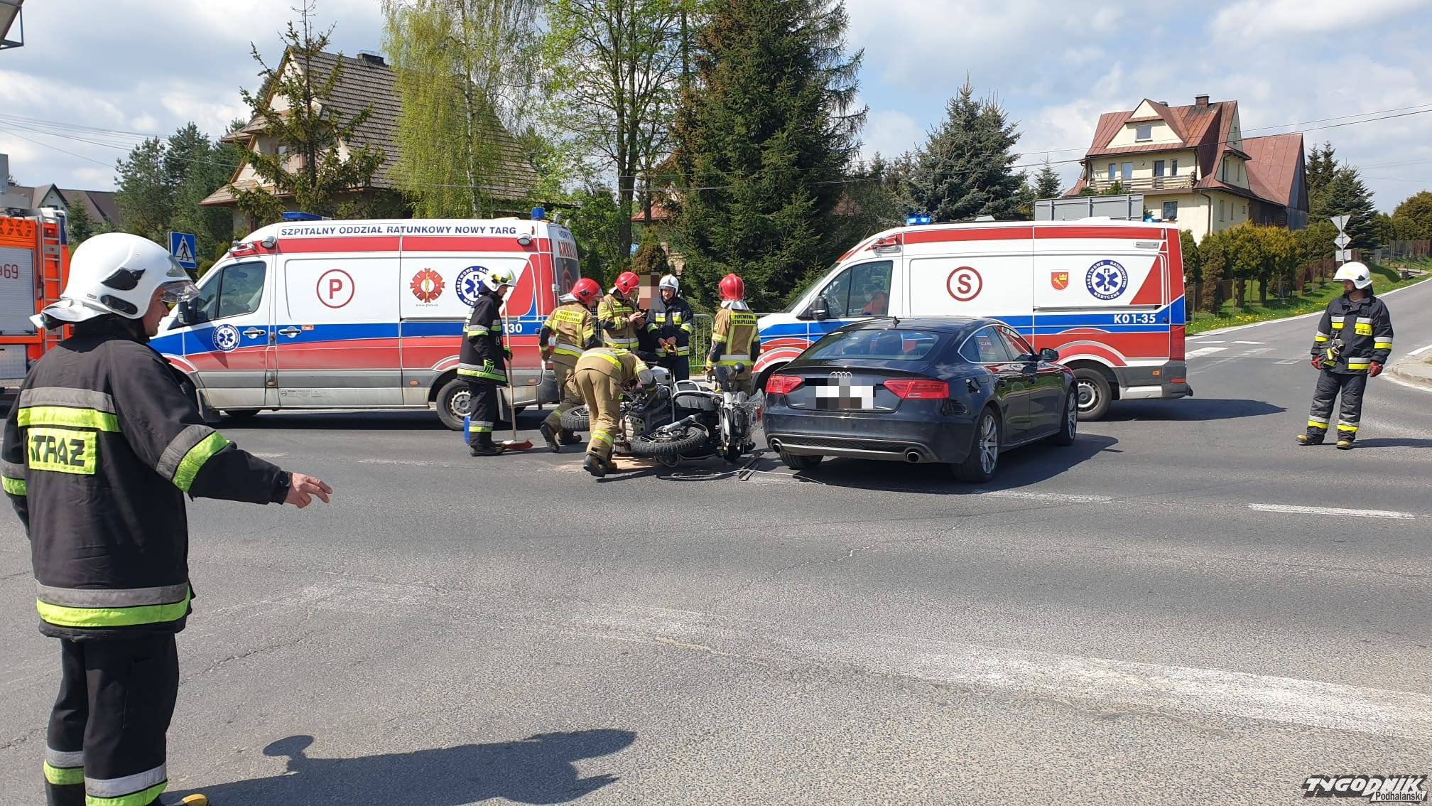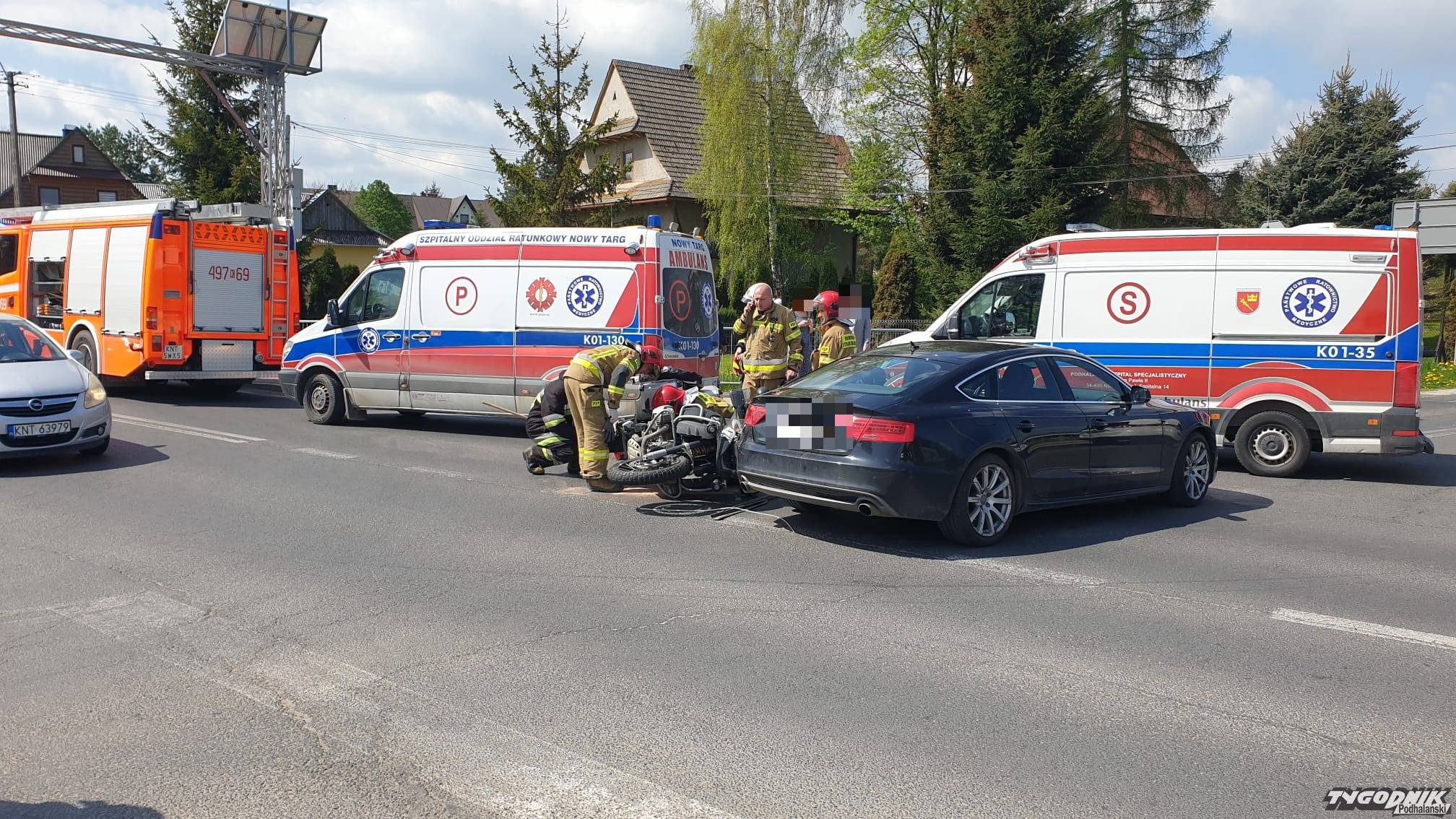 Wypadek zdarzył się po 10 w Gronkowie w rejonie skrzyżowania z drogą prowadzącą do Boru i Szaflar. W zderzeniu brał udział motocykl i samochód osobowy. Motocyklem podróżowały dwie osoby, która są opatrywane przez załogi ambulansów. Na miejscu są strażacy i policja. Ruch odbywa się wahadłowo.