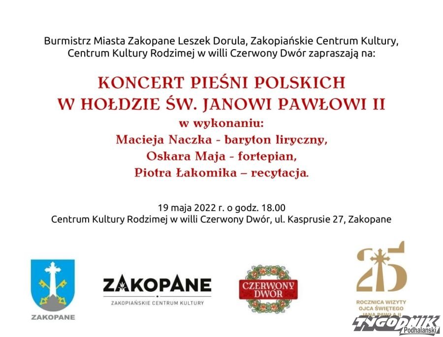 Koncert pieśni polskich w hołdzie Papieżowi Polakowi w czwartek 19.05 do Centrum Kultury Rodzimej w willi Czerwony Dwór w Zakopanem.