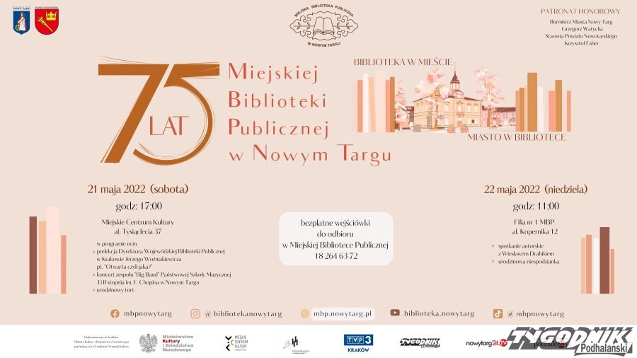 Dyrektor i pracownicy Miejskiej Biblioteki Publicznej w Nowym Targu zapraszają w sobotę i niedzielę 21-22 maja na jubileuszowe obchody 75-lecia powstania placówki.