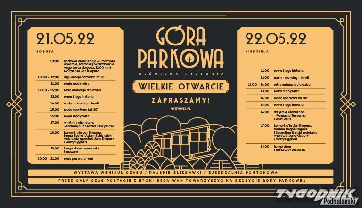 Na Górze Parkowej emocji nie zabraknie zwłaszcza, że wieczorem czeka na wszystkich prawdziwe i niezapomniane widowisko taneczne – pokaz tanga. Chętni będą mogli również spróbować swoich sił i wziąć udział w warsztatach tanecznych. Na spragnionych dodatkowych tanecznych atrakcji czekać będzie prawdziwa retro potańcówka z wodzirejem. Podczas wielkiego otwarcia Góry Parkowej będzie okazja by zdobyć niezapomniane retro upominki!