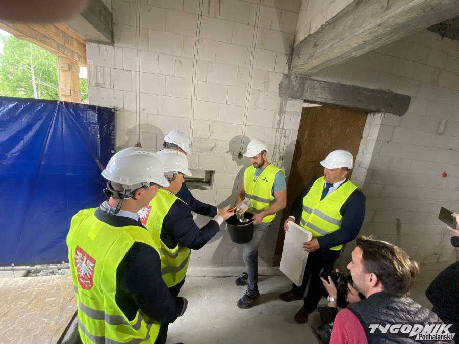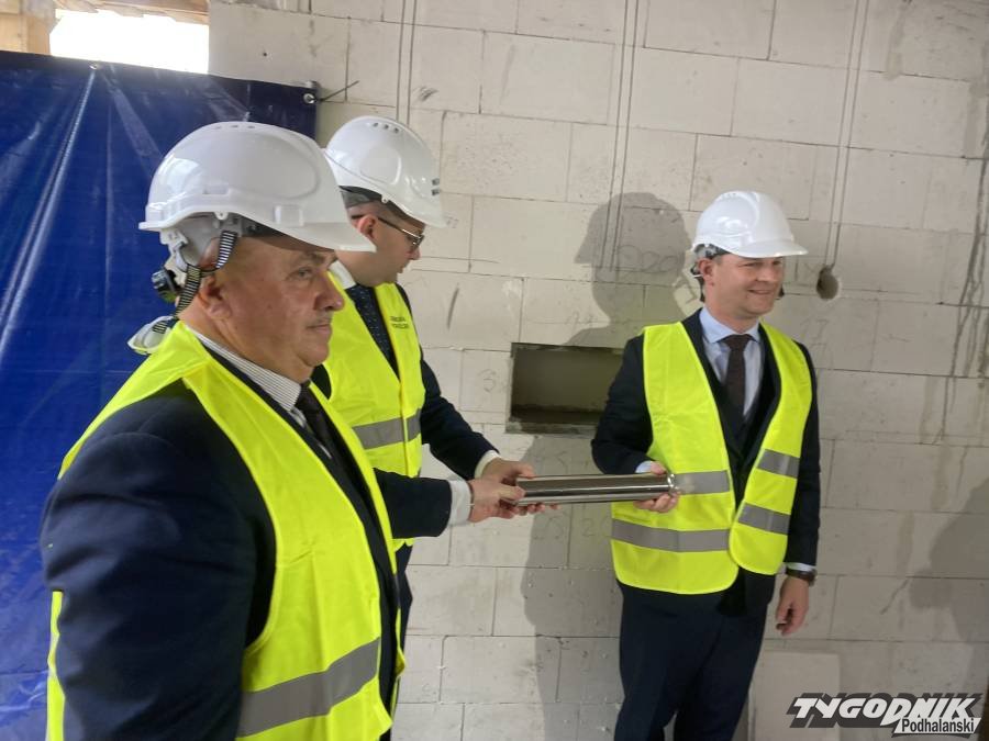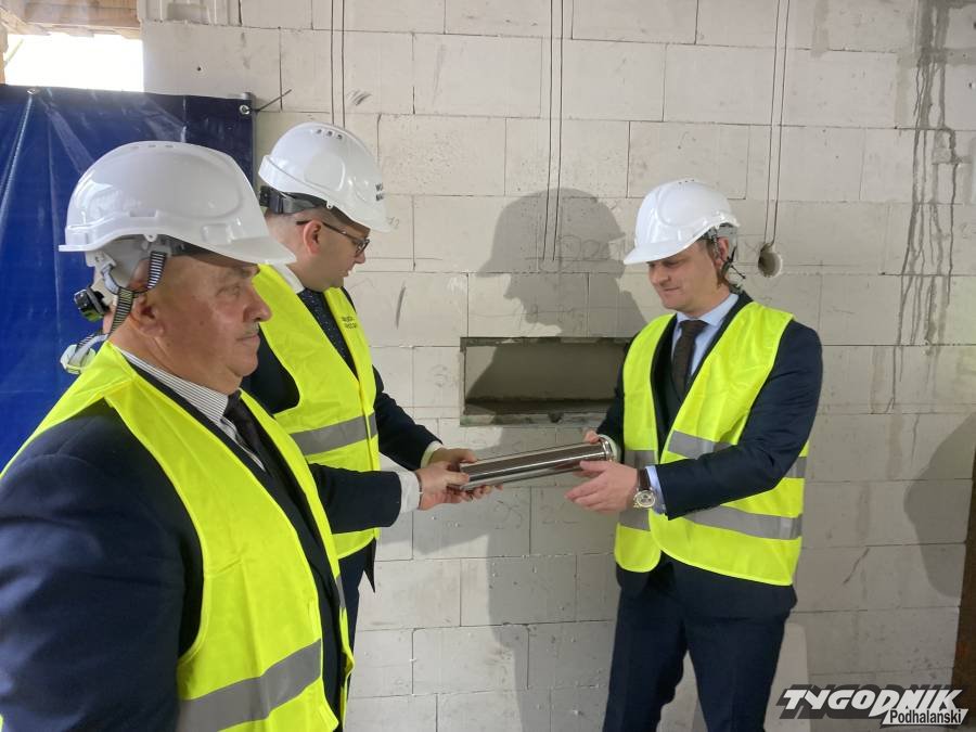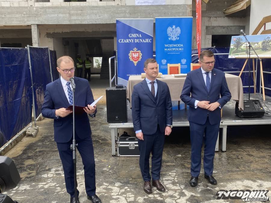 Wojewoda Małopolski Łukasz Kmita odwiedził dziś plac budowy samorządowego żłobka w Czarnym Dunajcu, przy ulicy Targowej. Mury obiektu są już gotowe, trwa krycie dachu. Wojewoda wspólnie z Wójtem Marcinem Ratułowskim i Przewodniczącym Rady Gminy Tadeuszem Czepielem – złożyli podpisy pod aktem erekcyjnym, który następnie został umieszczony w metalowej tubie i zamurowany. W tej ostatniej czynności asystowali sygnatariusze. Wojewoda był chwalony przez przedstawicieli firmy wykonawczej za sprawne posługiwanie się kielnią. Uroczystość uświetniły swymi występami przedszkolaki z sąsiadującego z żłobkiem przedszkola. Nie zabrakło też góralskiej muzyki.
