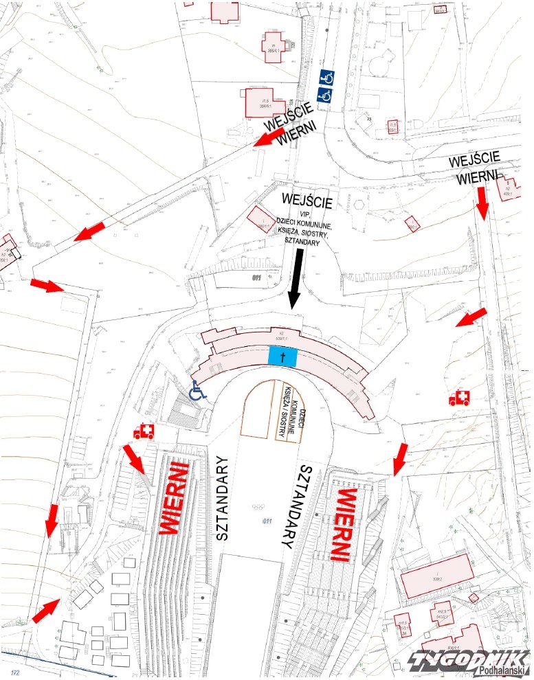 Pielgrzymów, ze względu na ograniczoną ilość miejsc parkingowych, zachęcamy do pozostawienia samochodów w innych rejonach miasta i miejscach zakwaterowania oraz do przybycie na Mszę Świętą pieszo lub komunikacją miejską.