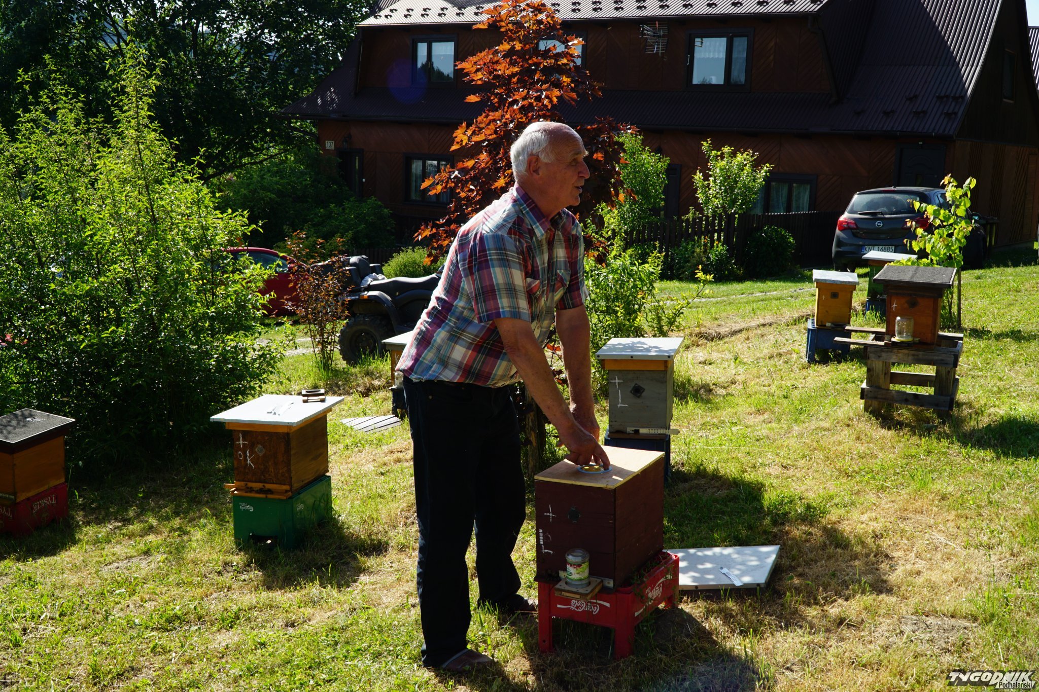 W drugiej połowie czerwca teoretycznie zelżały prace w pasiece. Pszczoły utraciły zapędy do rójek. Jest czas, by się zejść i porozmawiać o pszczołach, a o nich najlepiej dyskutować przy ulach. Spotkaliśmy się dzisiaj w pasiece Joanny Karwackiej i jej wujka Mariana Pytla w Podszklu na Orawie. Dziękujemy wszystkim uczestnikom, ale przede wszystkich gospodarzom dzisiejszego spotkania, Joannie i Marianowi oraz ich pomocnikom: Annie i Markowi Hosaniakom oraz Ewie i Józefowi Zapotocznym. A tak po prawdzie, to w pasiekach pracuje się stale. Nic samo nie przyjdzie. O pszczoły należy cały czas dbać i pracy mamy naprawdę dużo. My zaś po prostu lubimy się spotkać