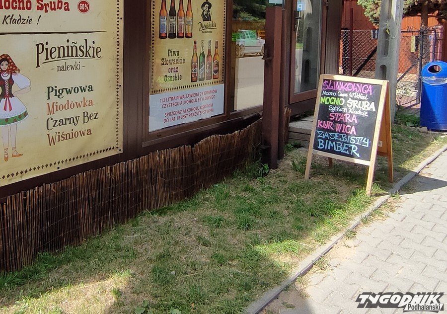 Jeden z turystów jest zbulwersowany nazwami alkoholi, które reklamowane są w sklepie w Sromowcach Niżnych.