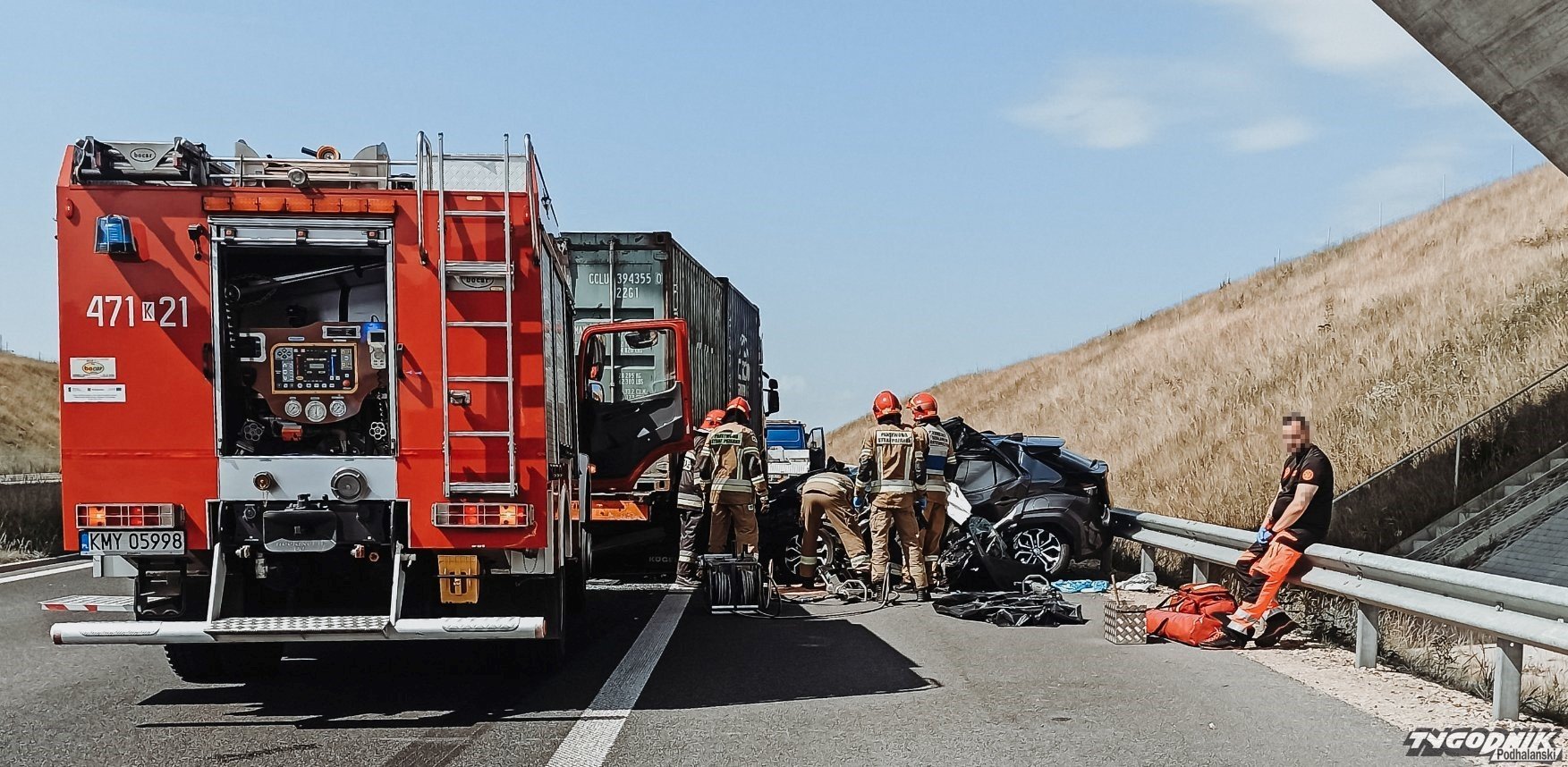 Do wypadku doszło w środę ok. godz. 9:20. 49-letni kierowca toyoty wjechał w tył naczepy od ciężarówki. - Według wstępnych ustaleń chwilę wcześniej 34-letni kierowca samochodu ciężarowego zatrzymał się w wyniku awarii układu hamulcowego - informują policjanci.