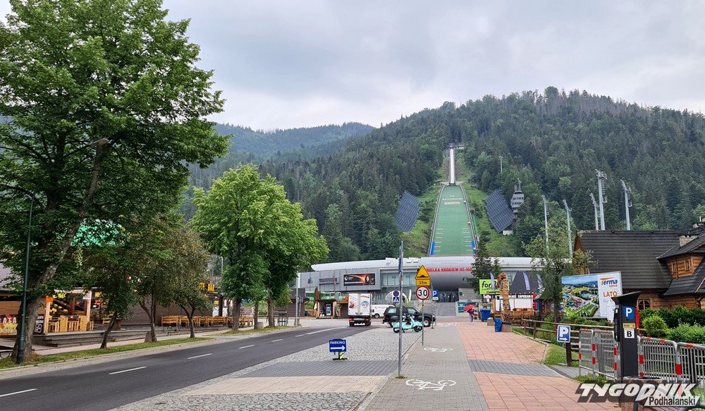 Przed godz. 9 w Zakopanem zaczął padać deszcz. Tak będzie przez najbliższe dwie doby. Chwilami opady mogą być intensywne. Na zdjęciu Wielka Krokiew w Zakopanem.