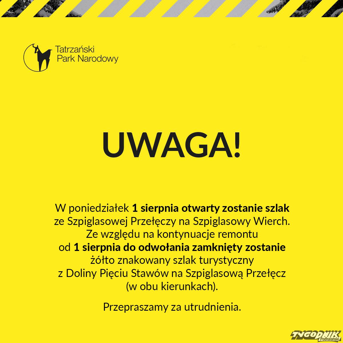 Tatrzański Park Narodowy informuje, że od 1 sierpnia zmiany w rejonie Szpiglasowej Przełęczy. Jutro zostanie otwarty górny fragment szlaku prowadzącego na Szpiglasowy Wierch, natomiast zamknięty będzie szlak z Doliny Pięciu Stawów Polskich na Szpiglasową Przełęcz.