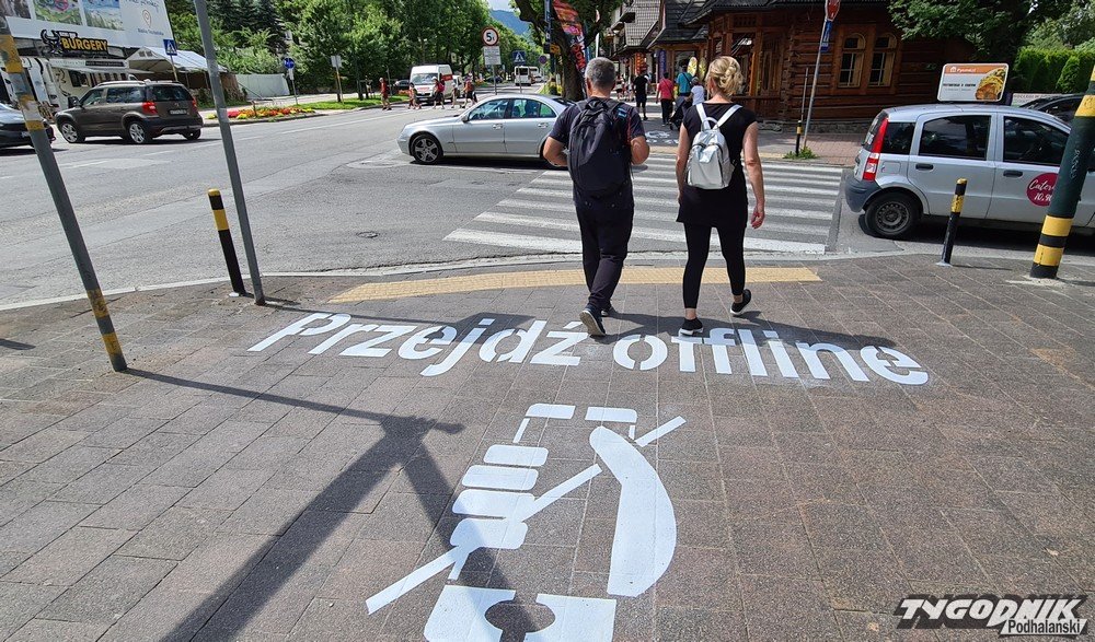Napisy zachęcające do odłożenia telefonu komórkowego przed przejściami dla pieszych zaczynają pojawiać się na chodnikach w Zakopanem.