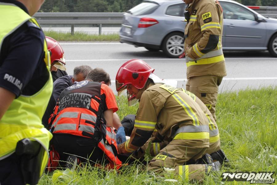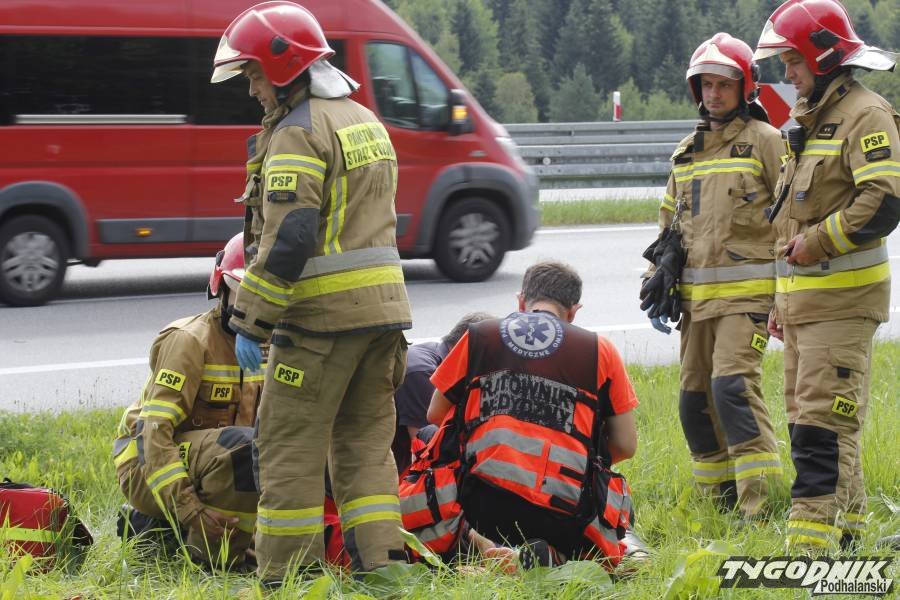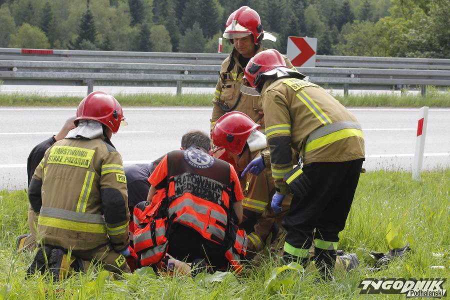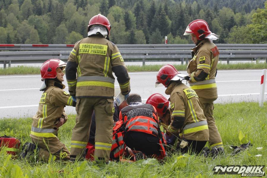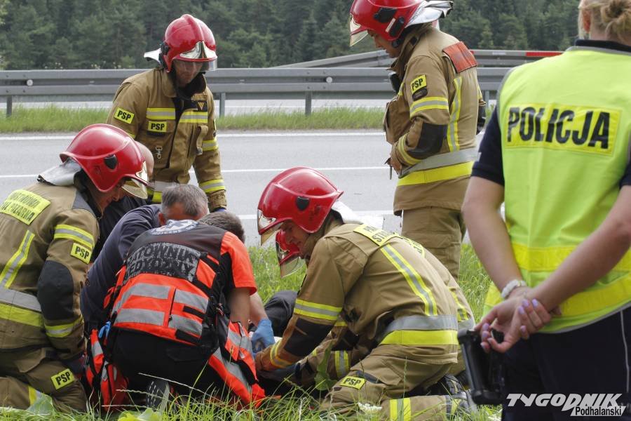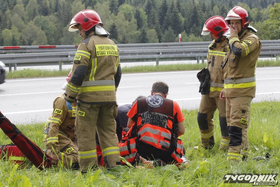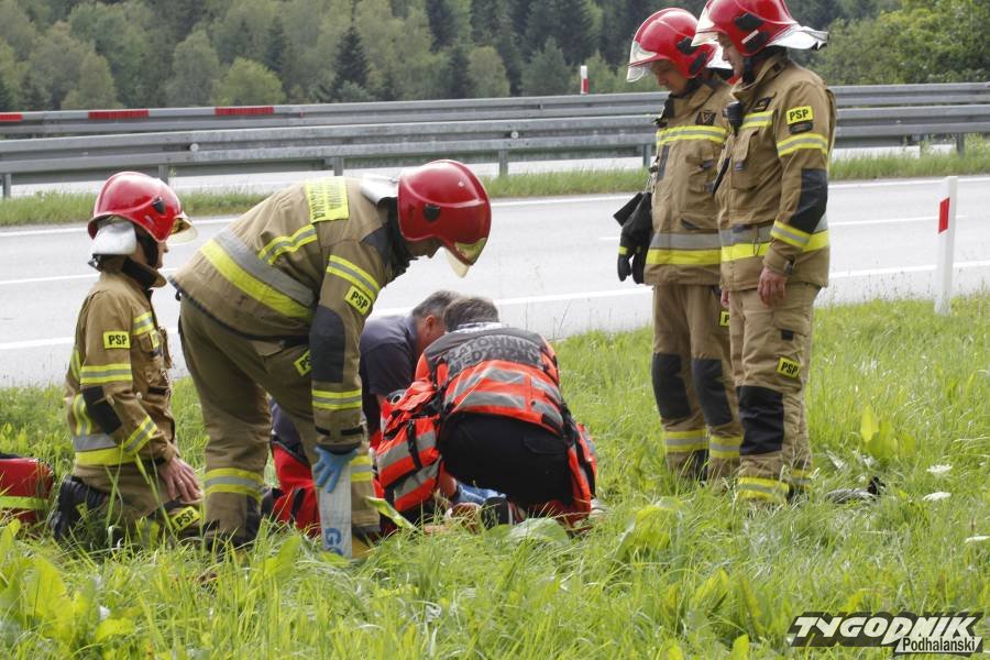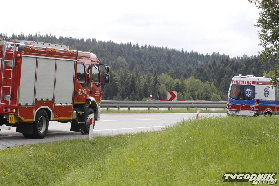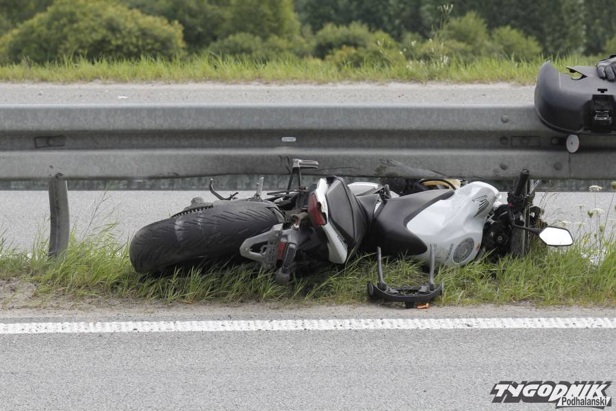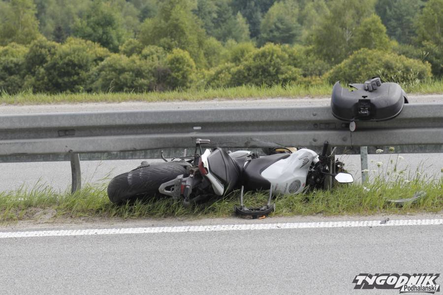 Wypadek zdarzył się przed jedenastą na ostrym łuku zakopianki tzw. "Patelni", na pasie w kierunku Zakopanego. Kierowca sportowej hondy, najprawdopodobniej zbyt szybko wszedł w ostry zakręt, stracił panowanie nad maszyną. Motocykl wywrócił się i szlifując po nawierzchni wbił się pomiędzy bariery energochłonne. Kierowca odniósł bardzo poważne obrażenia nogi. Jest w tej chwili opatrywany przez strażaków i załogę pogotowia. Na miejscu są też policjanci z rabczańskiego komisariatu i funkcjonariusze Wydziału Ruchu Drogowego z Nowego Targu.
