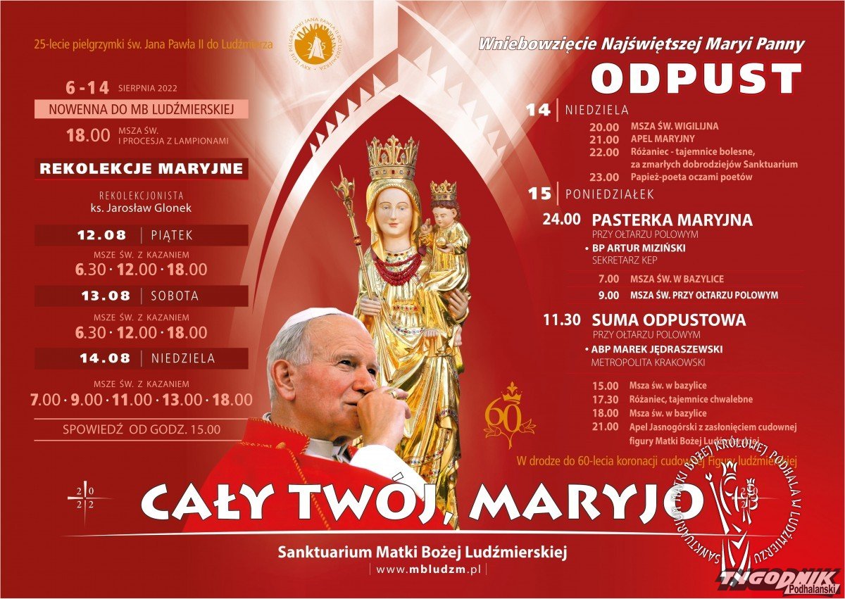 W poniedziałek 15 sierpnia w uroczystość Wniebowzięcia NMP pierwszym punktem odpustu w sanktuarium MBL będzie Msza o 7.00 w bazylice, sprawowana przez neoprezbiterów z archidiecezji krakowskiej. Natomiast Msza św. o 9.00 będzie na ołtarzu polowym - z udziałem złotych jubilatów kapłaństwa. Byłby w ich gronie zmarły kilka lat temu wieloletni ludźmierski kustosz ks. prał. Tadeusz Juchas. Eucharystii będzie przewodniczył o. Wojciech Kurzydło, kustosz sanktuarium Matki Boskiej Ludźmierskiej w Brampton w Kanadzie. Sumie odpustowej o godz. 11.30 będzie przewodniczył metropolita krakowski abp Marek Jędraszewski. Liturgię uświetni m.in. 21. Brygada Strzelców Podhalańskich.