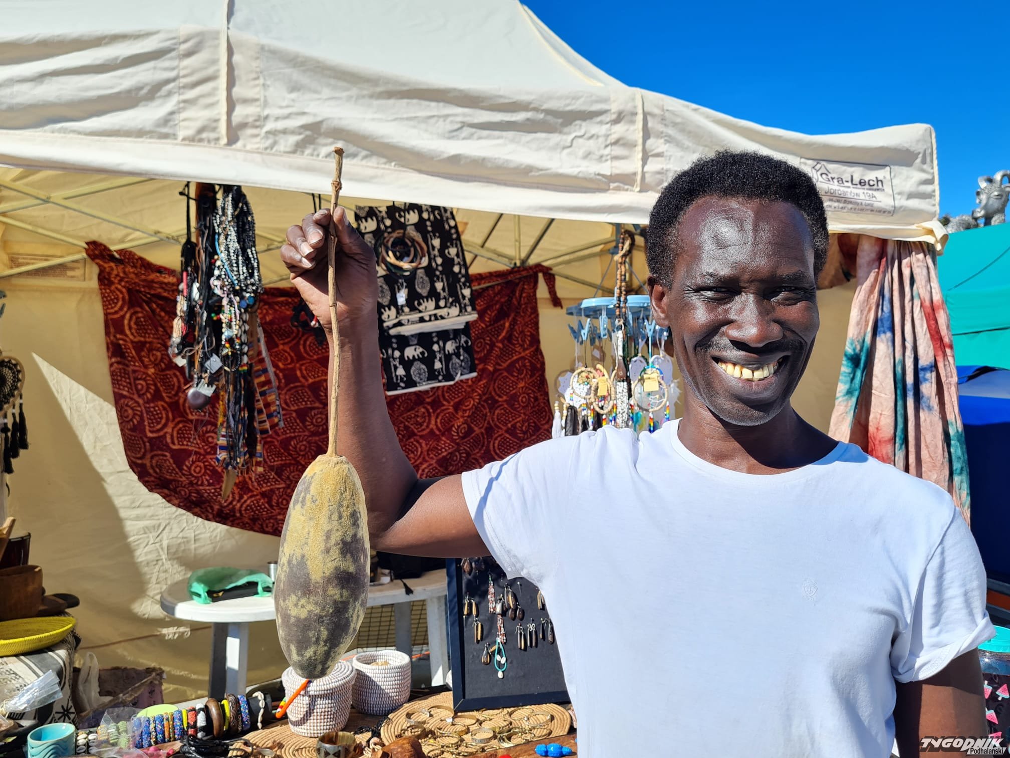 Samba Ndiaye pochodzi z Senegalu. W Polsce mieszka od 20 lat. Przyjechał z Krakowa. Na jego stosiku - Centrum Kultury Afrykańskiej "Teranga" - można nabyć wiele rarytasów niedostępnych nigdzie indziej. Teranga znaczy gościnność. Każdy z gości częstowany jest tu oryginalną herbatą, która - według zapewnień Samby - ma wiele witamin i mikroelementów i specyficzny kwaskowaty smak. Poleca też kadzidła, które są afrodyzjakiami. I owoce baobaby, które po wyżuciu można posadzić w doniczce. U Samby można nabyć piękne tkaniny, oryginalne instrumenty czy zaskakująco wygodne krzesła drewniane.