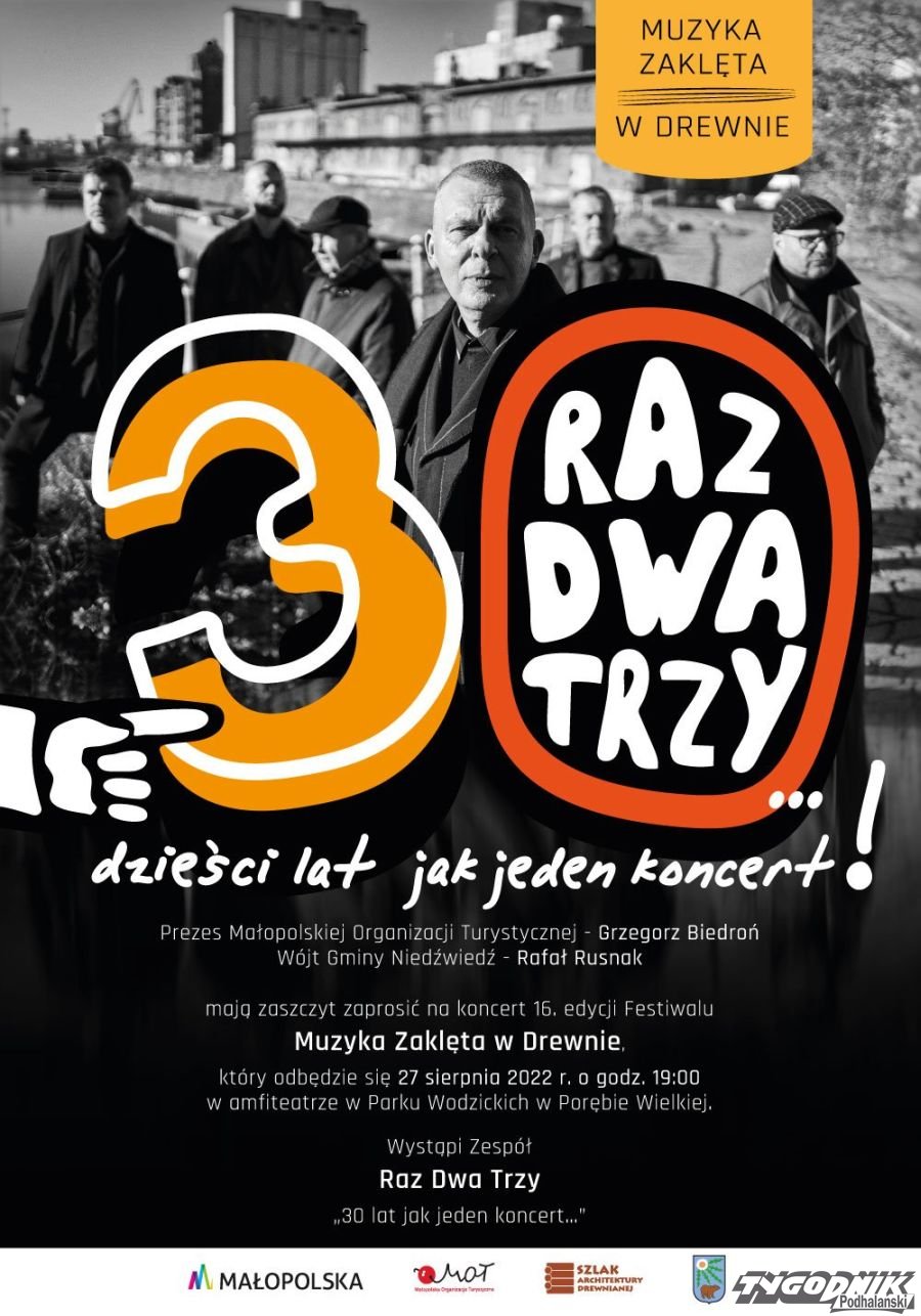 Grupa Raz Dwa Trzy, której trzydzieści lat na scenie minęło jak jeden koncert, zagra w Porębie Wielkiej w plenerze - w amfiteatrze w Parku Dworskim hr. Wodzickich. Początek – godzina 19.