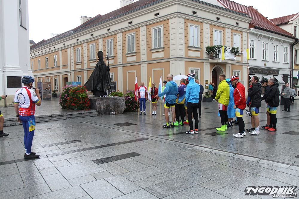 W strugach deszczu niezmordowani kolarze wyruszyli w stronę Wadowic, gdzie uczestniczyli we mszy świętej o godzinie 10. Następnie złożyli wieniec przy pomniku Św. Jana Pawła II i uroczyście odśpiewali „Barkę”. I choć deszczowa pogoda nie odpuszczała, cykliści wyjechali w dalszą drogę, w stronę Częstochowy i Jasnej Góry.