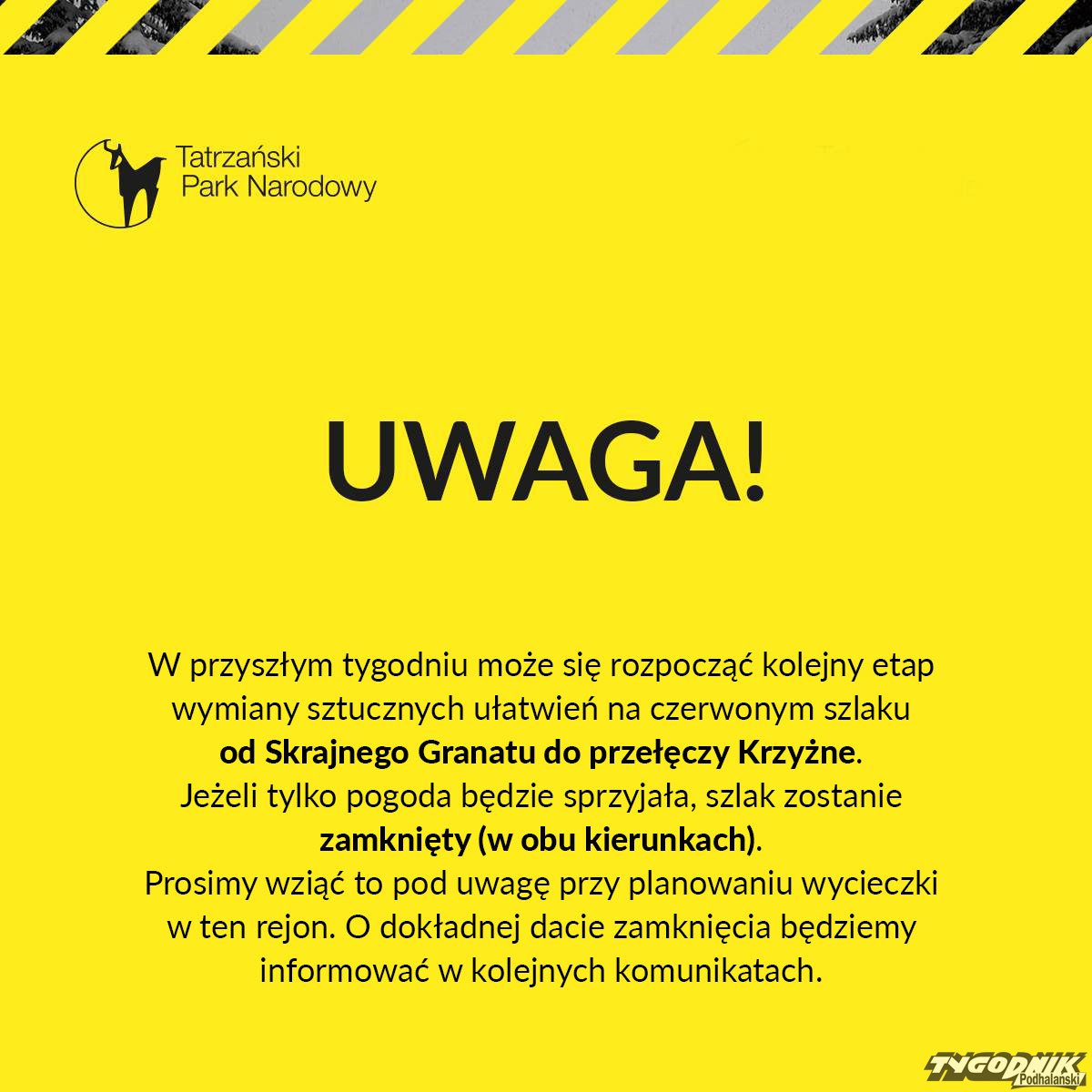 W przyszłym tygodniu TPN planuje zamknięcie czerwonego szlaku od Skrajnego Granatu do Przełęczy Krzyżne.