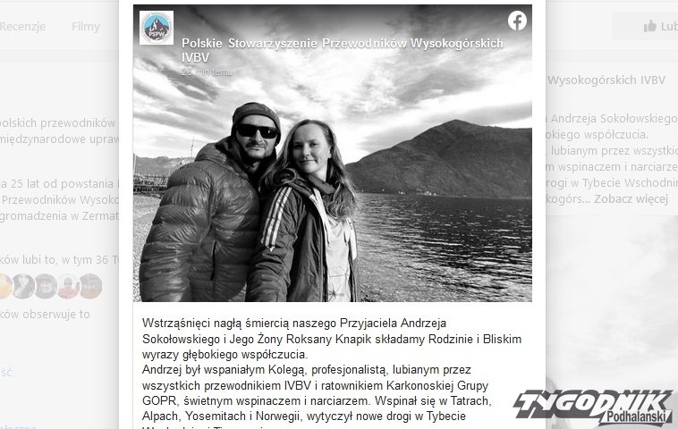 Pod Staroleśnym Szczytem w Tatrach Słowackich zginęło małżeństwo z Polski. Oboje byli przewodnikami. Zmarłych żegnają koledzy z Polskiego Stowarzyszenia Przewodników Wysokogórskich IVBV.