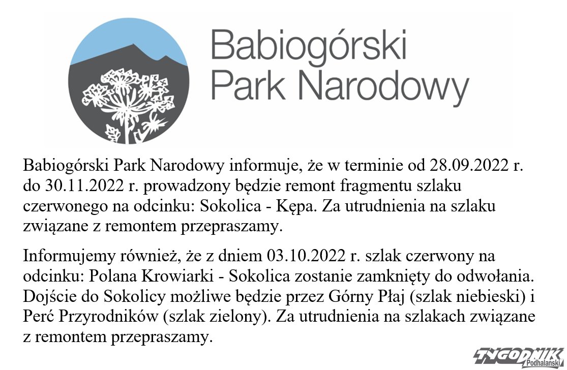 Z kolei od 3 października do odwołania będzie zamknięty szlak czerwony na odcinku Polana Krowiarki - Sokolica. Dojście do Sokolicy możliwe będzie przez Górny Płaj (szlak niebieski) i Perć Przyrodników (szlak zielony). Tu również prowadzony będzie remont szlaku.