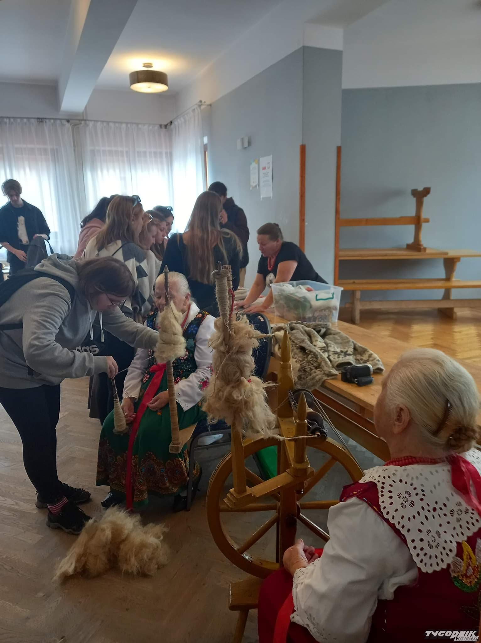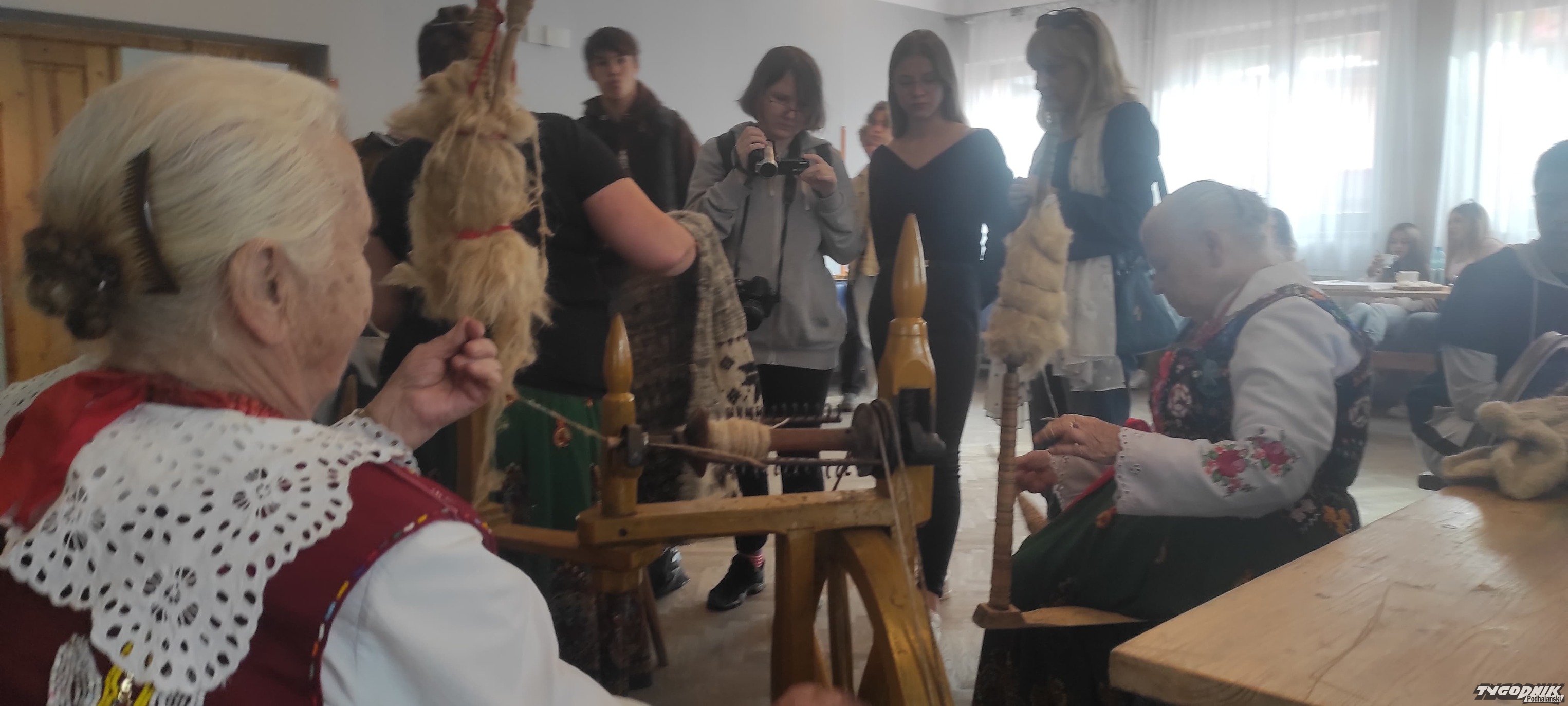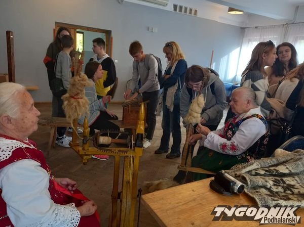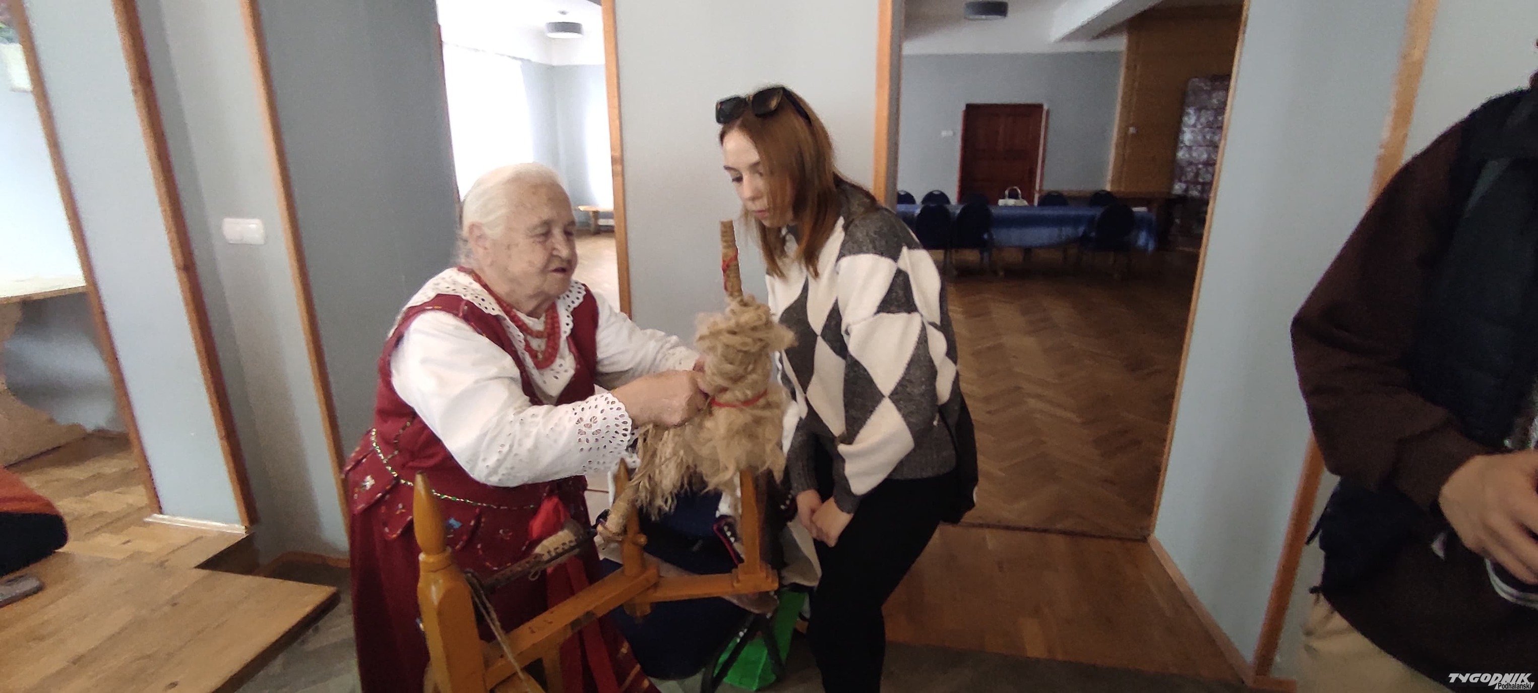 Ochotnickie gaździny pokazywały, jak się obrabia wełnę.